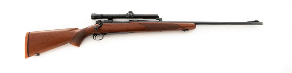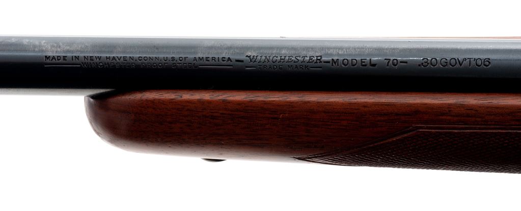 Pre-64 Winchester Model 70 Bolt Action Rifle, #71793, .30-06 cal., 24'' barrel, blue finish, checkered walnut stock, with later Winchester red rubber butt pad. Topped with a Lyman Alaskan All-Weather scope on Stith scope mounts. Mfg'd 1947. Condition is very good retaining approx. 94% blue. Stock shows evidence of a previously installed Lyman or Redfield peep sight. Stock has been refinished at one point and checks may have been re-traced. Good action, fine bore, clear optics. Est.: $450-$650. (C&R)