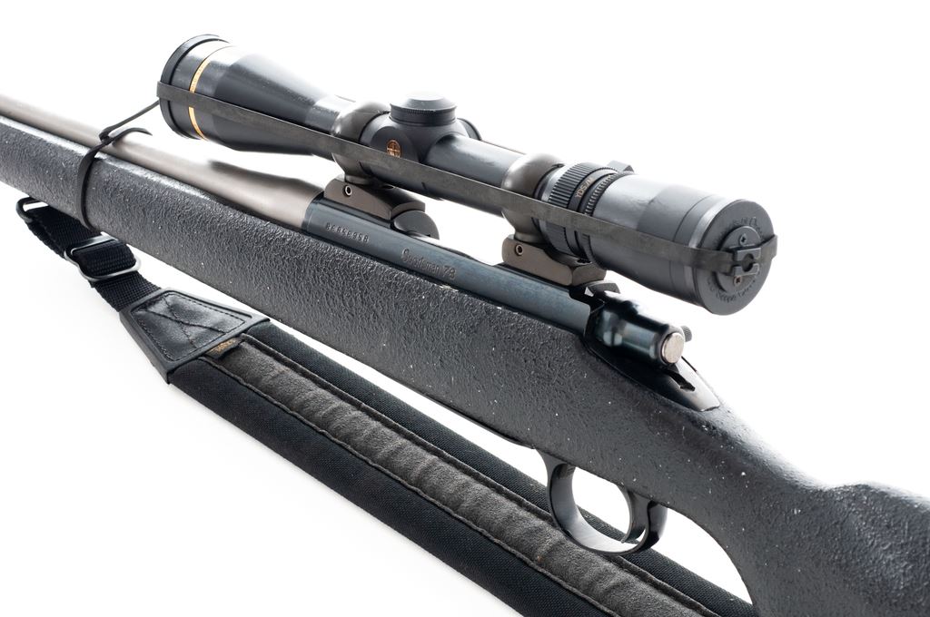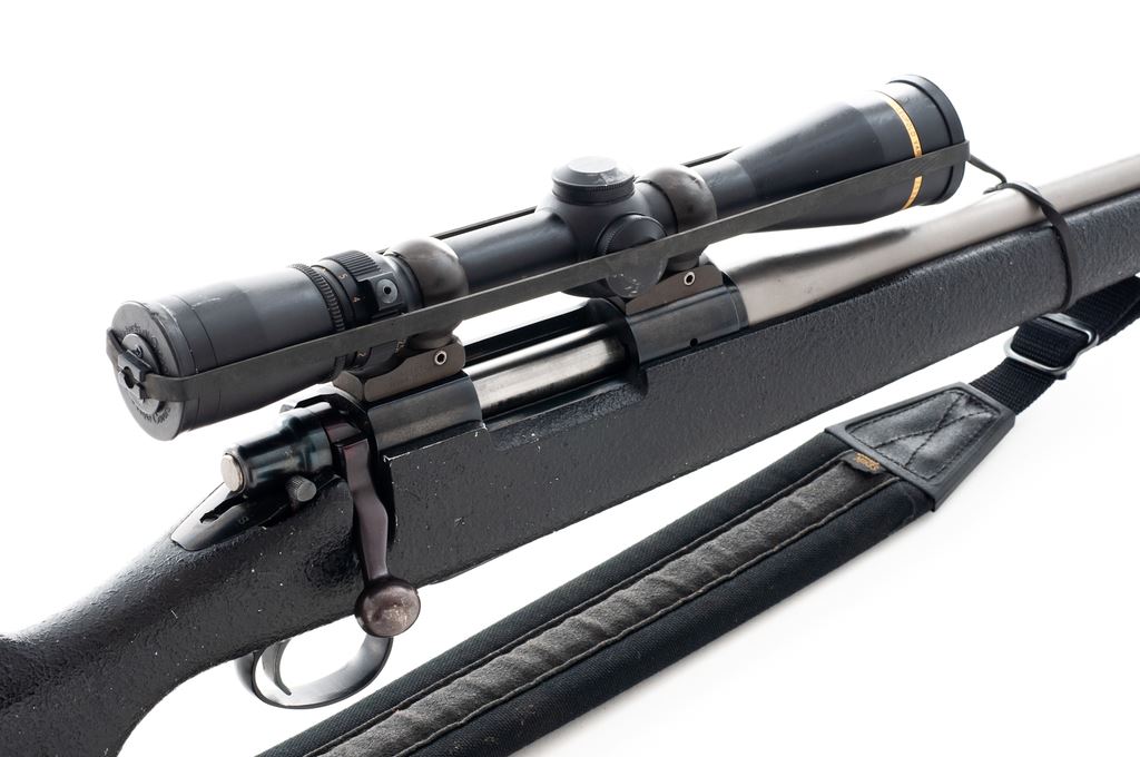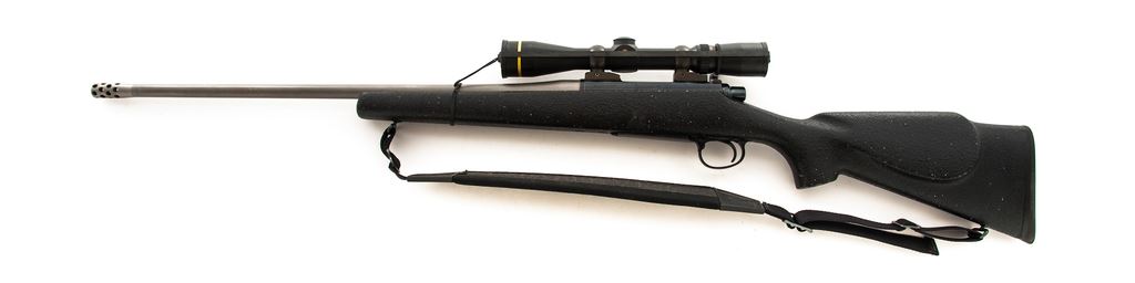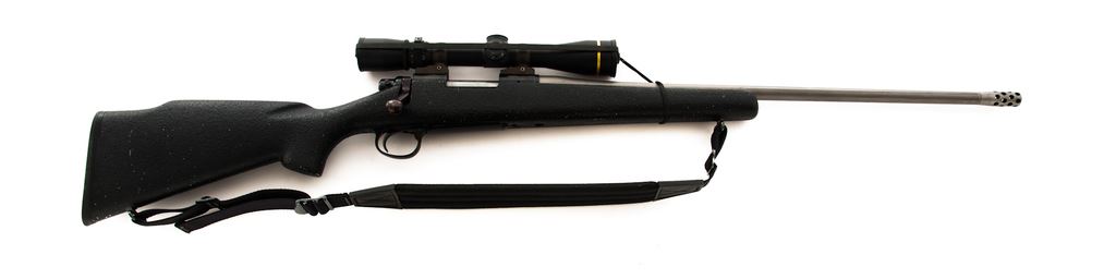Remington Sportsman 78 Bolt Action Rifle, #B6856958, .223 Rem. cal., 24'' stainless steel compensated barrel by Spencer Custom Guns, blue receiver, standard bolt, with composite pebblegrain stock and nylon sling. Topped with a Leupold Vari-X III 2.5-8x40 scope on Conetrol rings and mounts. Condition is fine as modified. Stock shows some minor losses to finish. Trigger has been smoothed and lightened. Clear optics with duplex reticle. Mirror bright bore. Est.: $400-$600. (Modern)