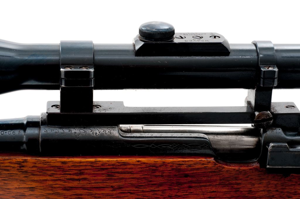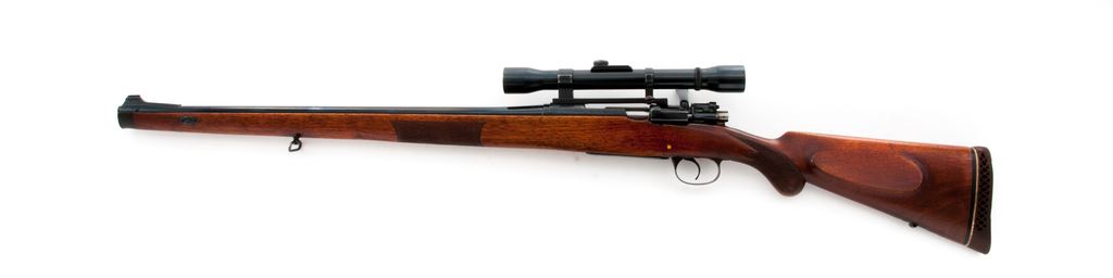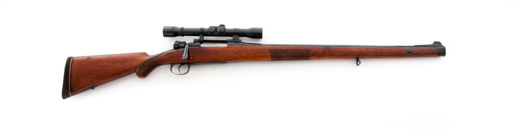Sporterized Mauser 98 Bolt Action Rifle, NVSN, .30-06 cal., 24'' barrel, blue finish, Mannlicher cheekpiece round-knob checkered walnut stock, with brown rubber pad. Topped with a Weaver KV fine crosshair dot reticle scope, on Redfield mounts and high rings. Condition is excellent as modified retaining approx. 94% salt blue finish. Stockwork is nicely executed. Good action, bore and optics. Est.: $300-$500. (Modern)