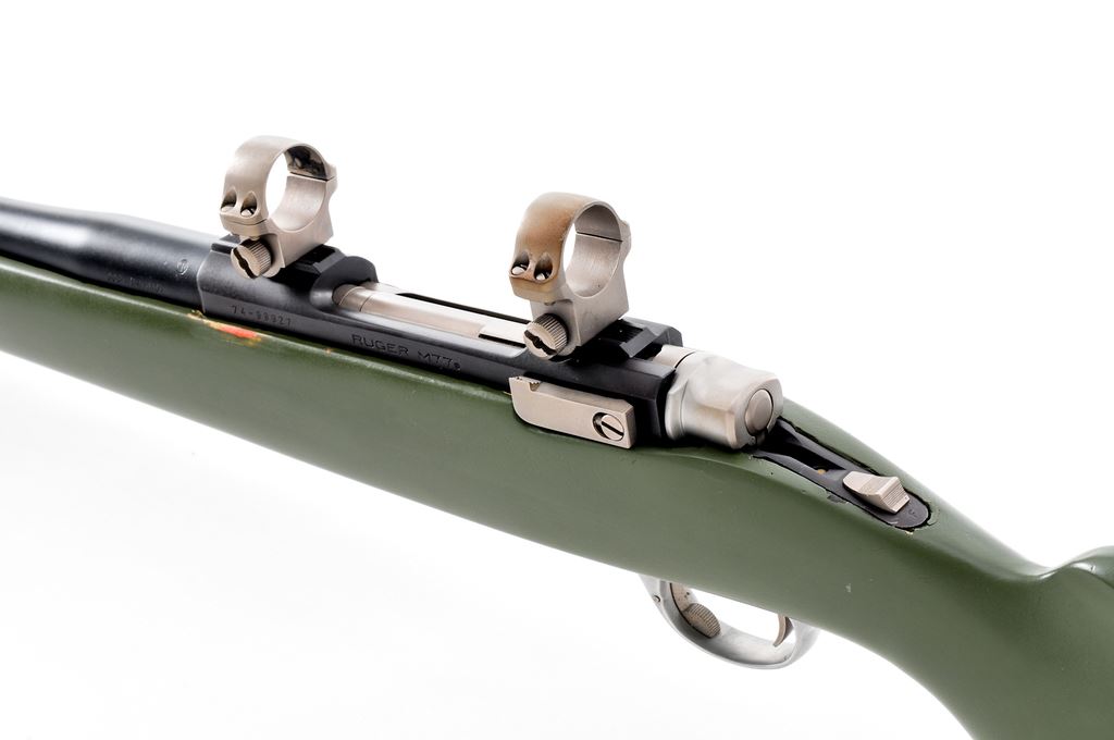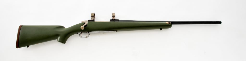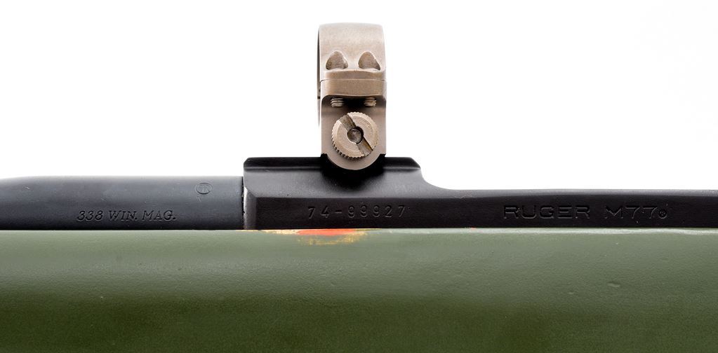 Ruger M77 Bolt Action Rifle, #74-99927, .338 Win. mag. cal., 22'' ported barrel, matte blue/black finish, painted green composite stock, brown rubber Pachmayr ''Old English'' recoil pad, bright aluminum triggerguard and floorplate, matte silver bolt and bolt release, with sling swivel studs and topped with a set of matte silver scope rings. Mfg'd 1980. Metal surfaces are in fine condition, with at least the barrel being refinished over a few scattered patches of pinprick pitting. Stock is very good with normal small marks from handling and field use. A majority of the added green paint remains with finish loss at the top and bottom edge of the buttstock, forend and upper edges. Smooth crisp action, excellent bore. Est.: $400-$600. (Modern)