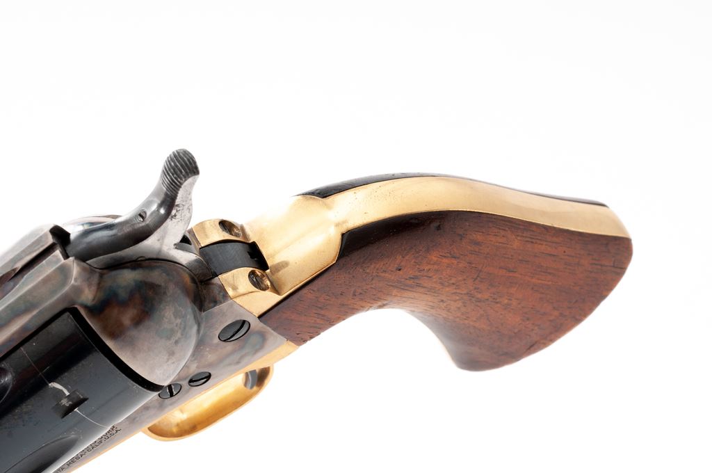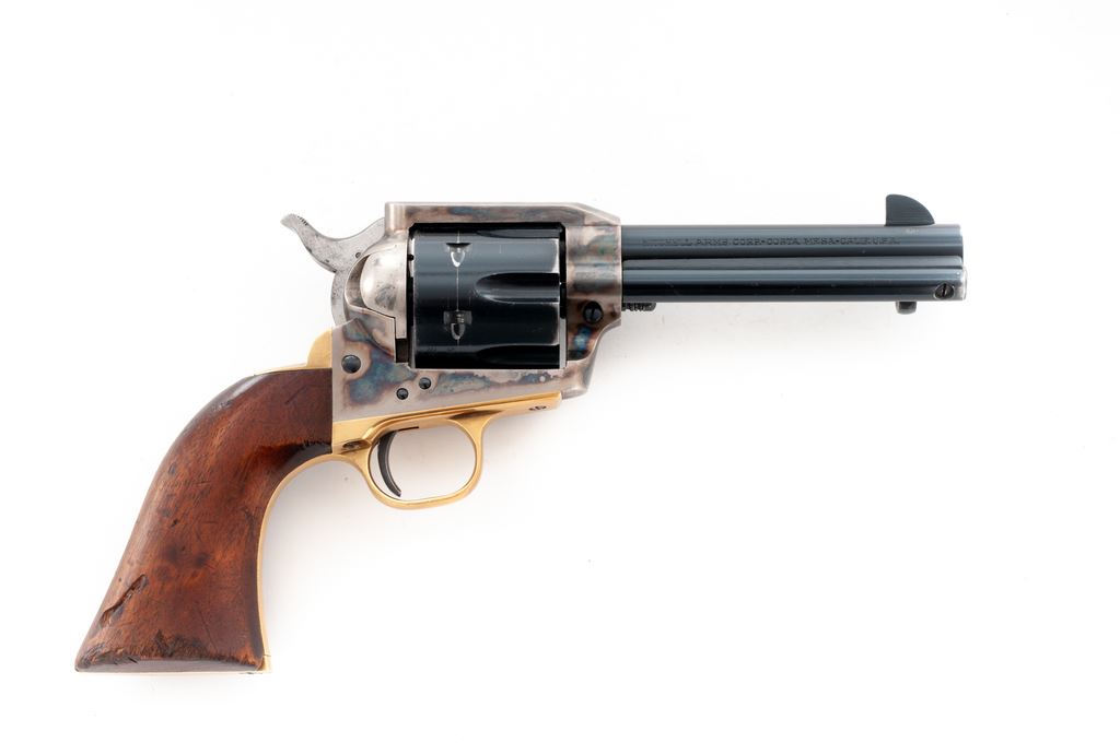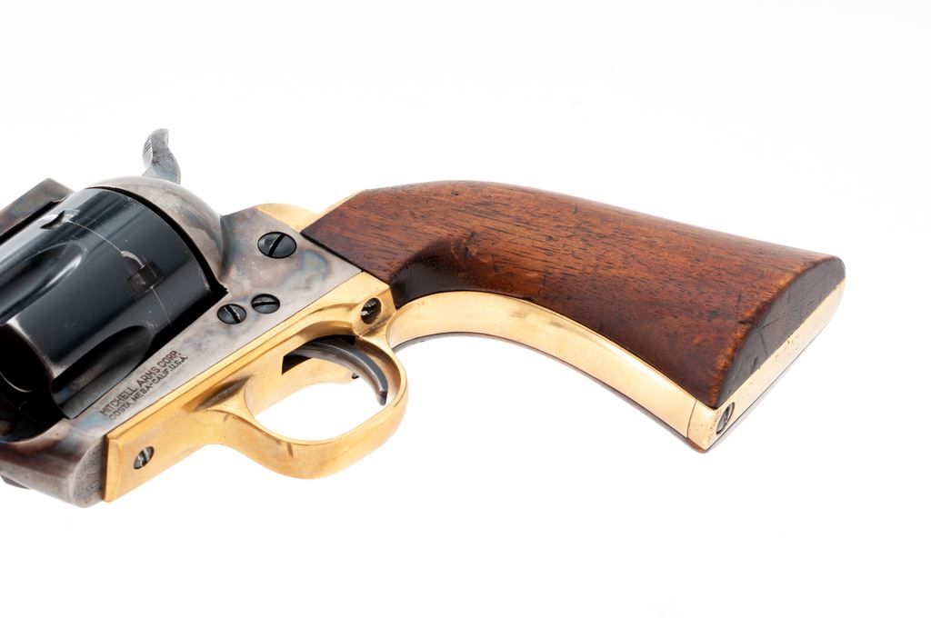 Mitchell Arms Single Action Army Revolver, #56786, .44 mag. cal., 4.75'' barrel, blue finish, case hardened frame, brass triggerguard, one-piece smooth walnut grips with standard sights. Mfg'd by Uberti. Metal rates as very good with approx. 90%-92% blue finish, with wear at the muzzle and highpoints of cylinder. Frame with approx. 75% case colors. Brass butt with tiny impressions. Grips are fair and show considerable wear; right grip with several impressions and a larger gouge along bottom and back edge. Action is smooth and crisp, bore is very good. Est.: $250-$350. (Modern/PPT)
