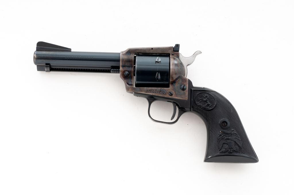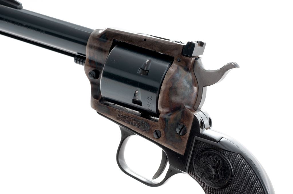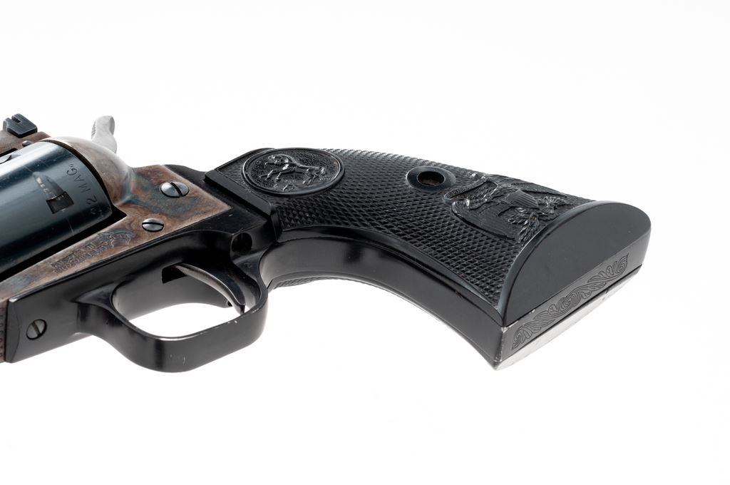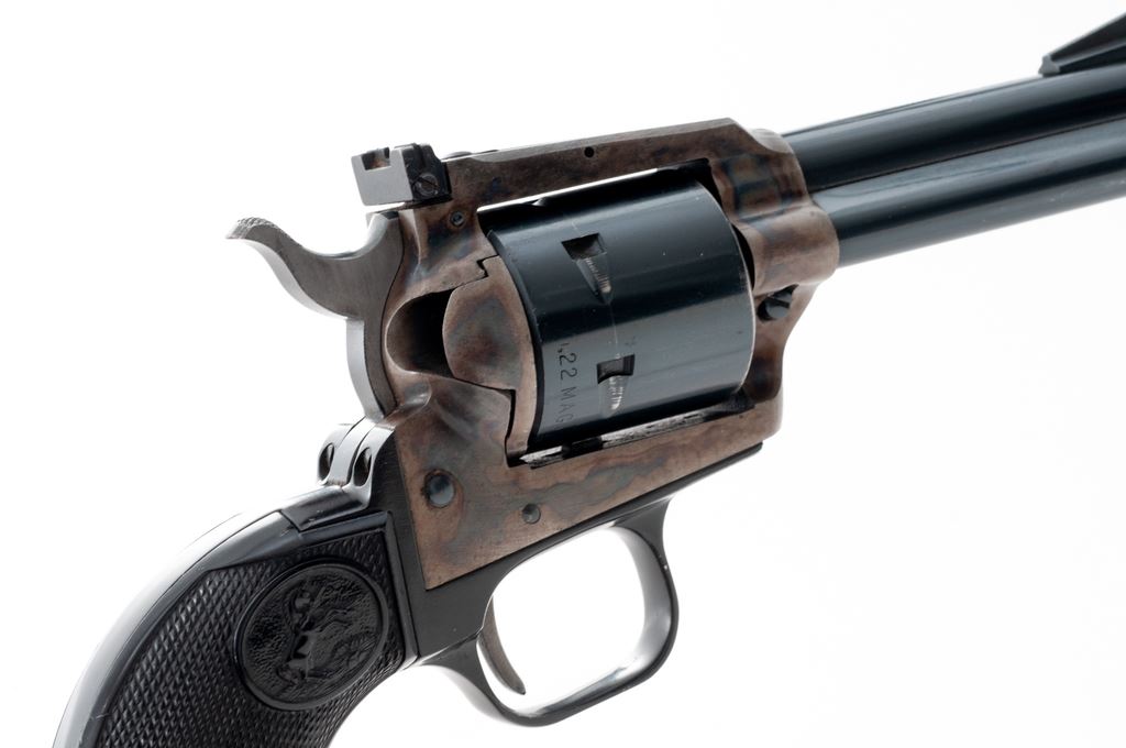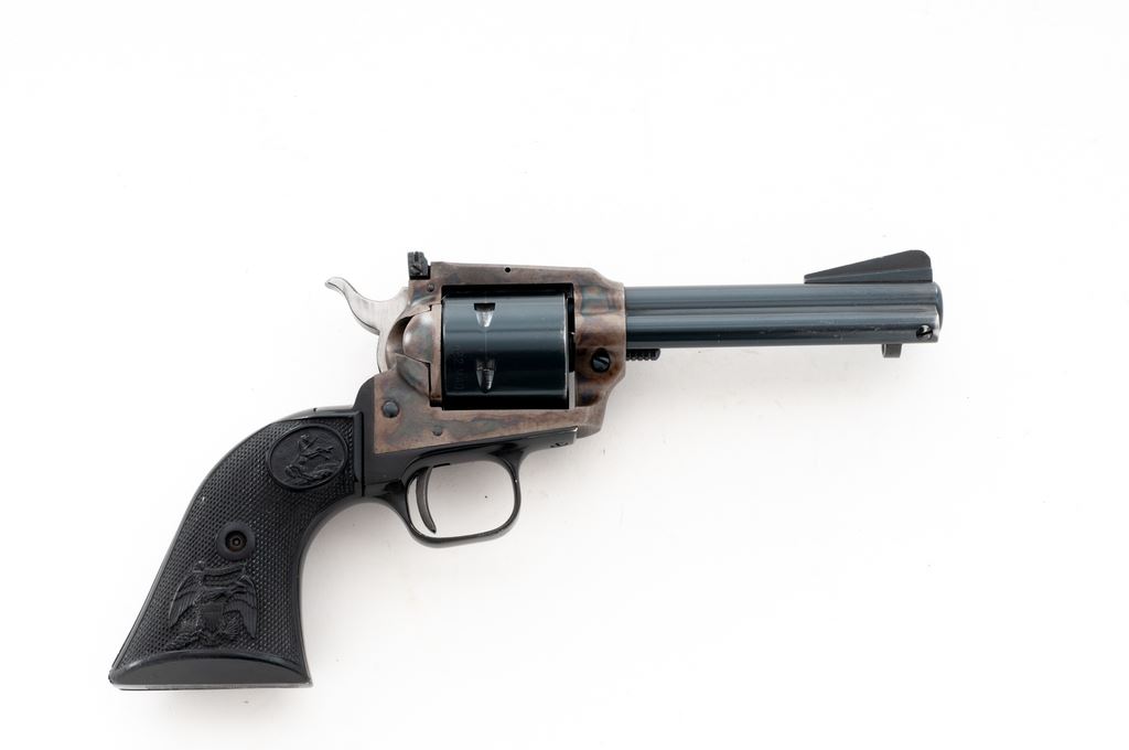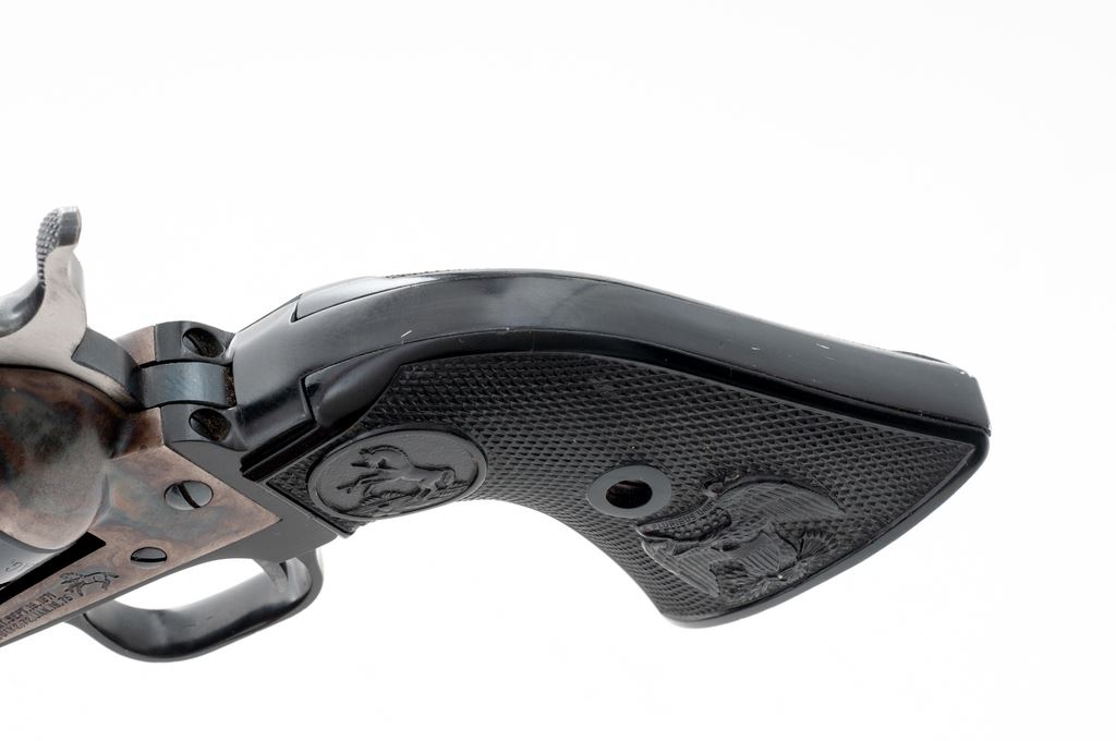 Colt New Frontier Single Action Revolver, #G105893, .22 mag. cal., 4.5'' barrel, blue and case hardened finish, factory checkered black plastic eagle grips, with factory adjustable sights. Condition is excellent retaining approx. 98% blue, with minor thinning to forward edge of cylinder, barrel at muzzle, and tip of ejector rod. Good action, bright bore. Est.: $400-$600. (Modern/PPT)