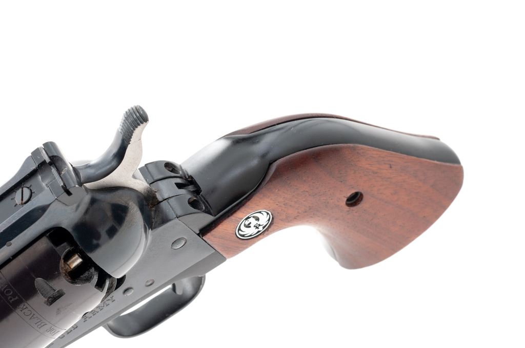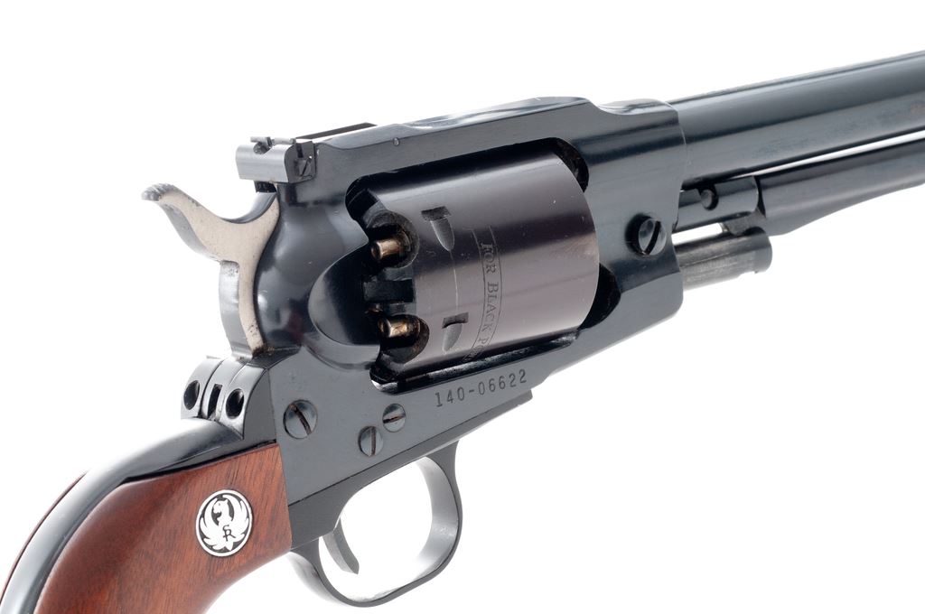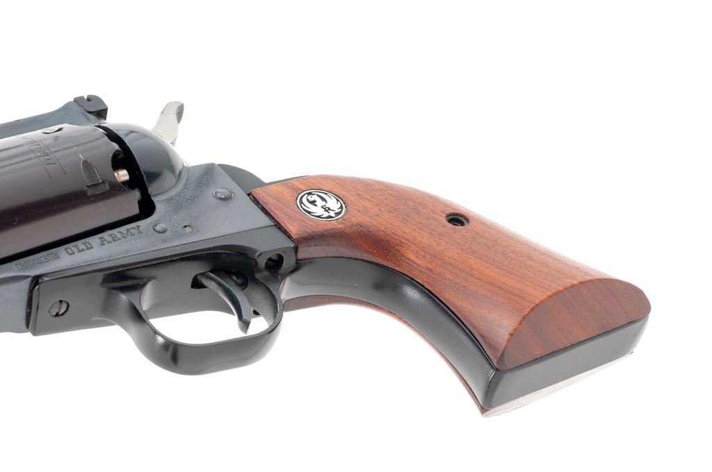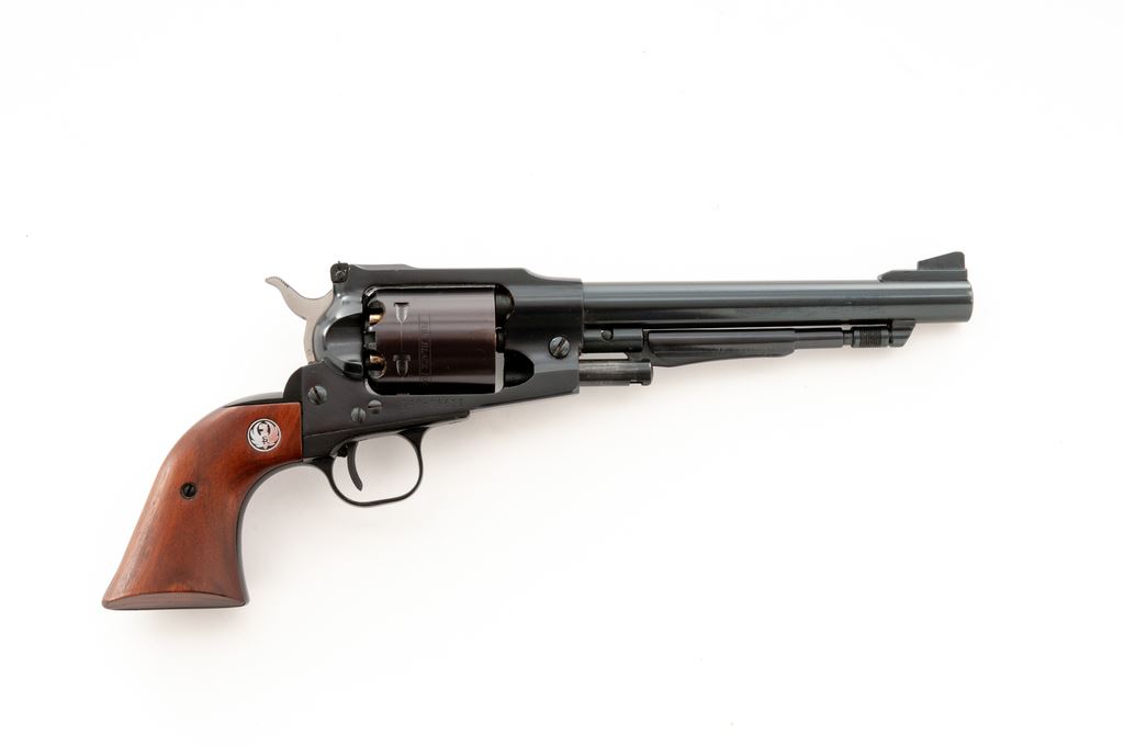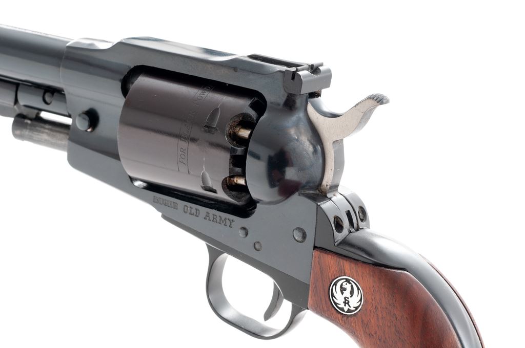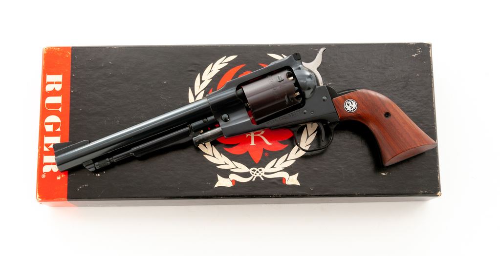 Early Ruger Old Army Black Powder Percussion Single Action Revolver, #140-06622, .45 cal., 7.5'' barrel, dark blue finish, smooth walnut grips with Ruger ''silver eagle'' medallions, fixed large blade front sight with a fully adjustable rear sight. In original two-piece red/black/white box that is hand numbered with only the first 4-digits visible; what is visible matches the revolver. Also includes the owner's manual, warranty card, and nipple wrench. Mfg'd 1973. Condition is excellent with approx. 98% original blue; cylinder with plum-colored toning and a light thin index line. Grips with a few minor handling marks, including a slight superficial scratch towards the bottom of the right grip; medallions are bright. All factory marks are crisp and clear. Action is excellent; bore is bright with strong rifling. Box shows normal light storage wear. Est.: $400-$600. (Modern/PPT) (This revolver is not classified as an antique and does require an FFL.)