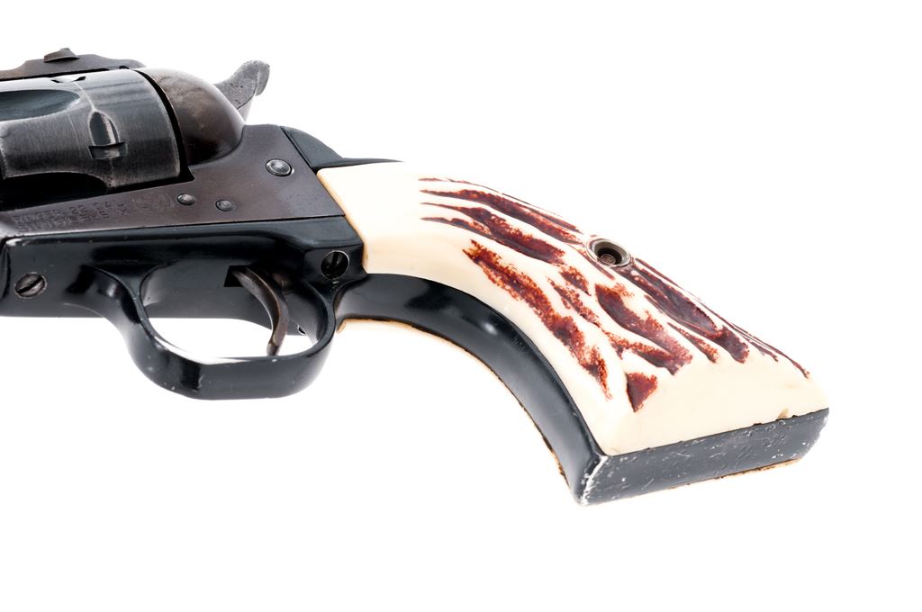 Early Ruger Single Six Single Action Revolver, #94291, .22 LR cal., 5.5'' barrel, blue/black finish, faux stag grips, with standard fixed sights. Mfg'd 1958. Condition is good. Metal with approx. 40% remaining finish, barrel and frame with areas of brown patina and yellowish toning, some which may be from cleaning. Right grip with a hairline crack near the screw. Action is crisp, bore is very good. Est.: $125-$250. (C&R/PPT)