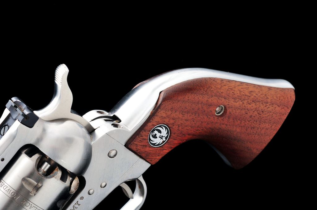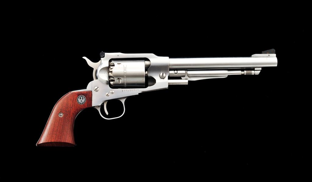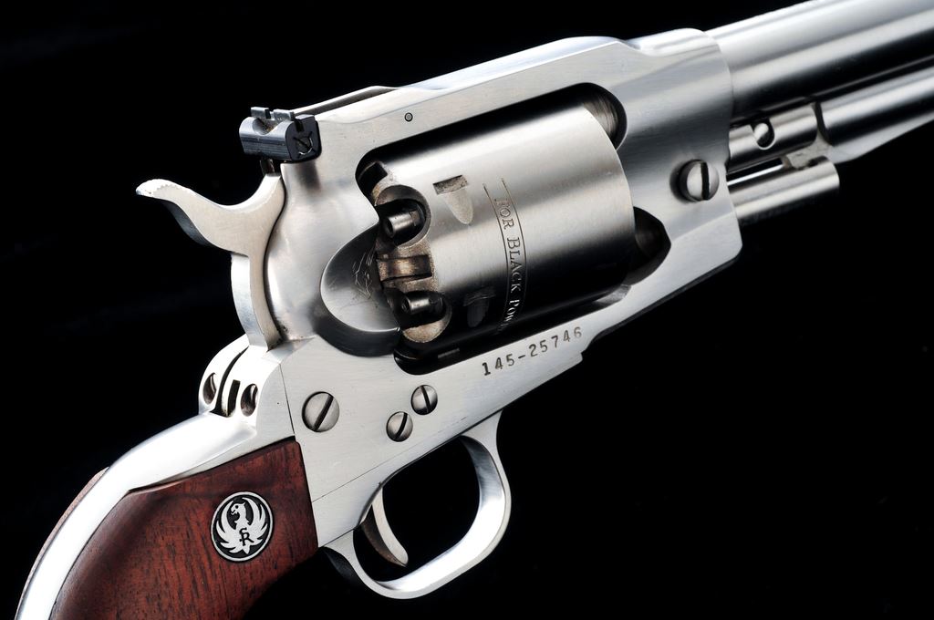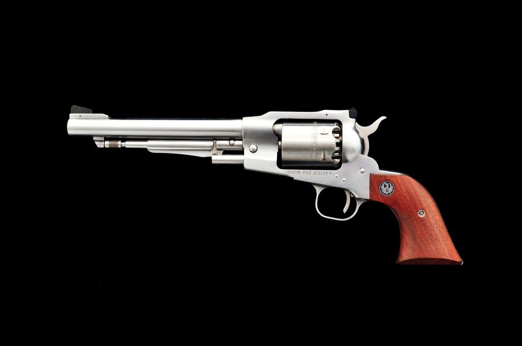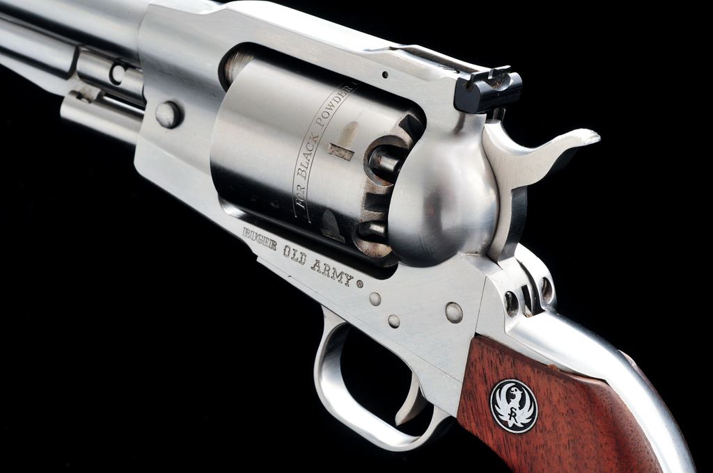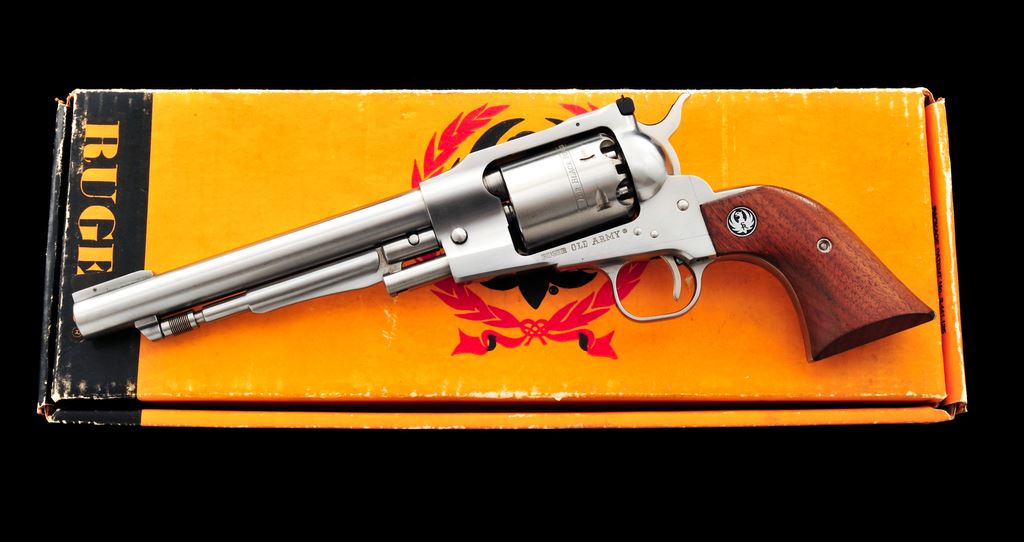 Ruger Old Army Percussion Single Action Revolver, #145-25746, .45 cal., 7.5'' barrel, stainless steel, smooth wood grips with silver Ruger medallions, fixed blade front sight, with a fully adjustable square notched rear sight. Included is a one-piece Ruger box with owner's manual and nipple wrench; box lacks any sort of firearm identification. Metal rates as very good showing signs of moderate use and handling, including scattered micro-scratching and rub marks. Loading cutout with a few more noticeable scratches. Grips rate fine with a few normal light handling marks. Action is smooth and crisp with a bright bore. Box shows moderate age and storage wear. Est.: $400-$600. (Modern/PPT) (This revolver is not classified as an antique and does require an FFL for registration.)