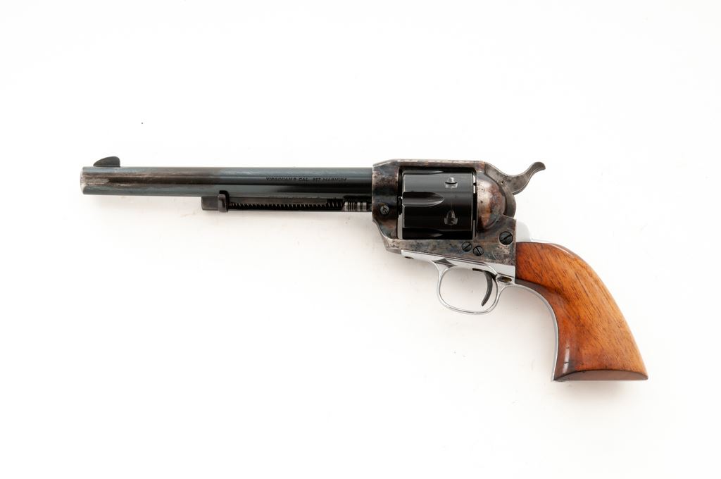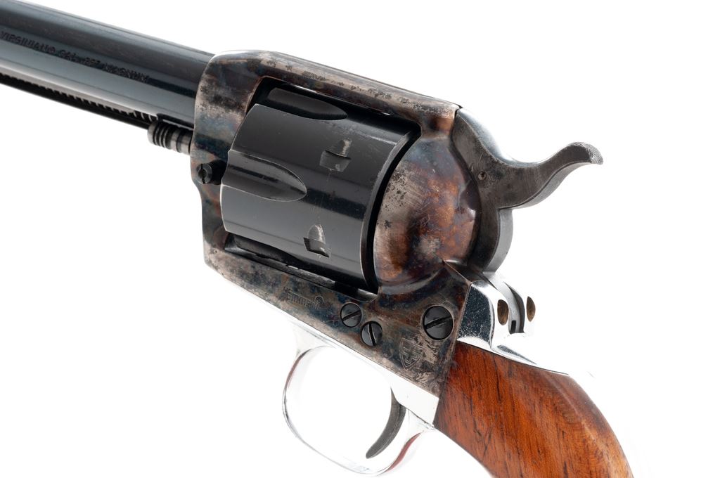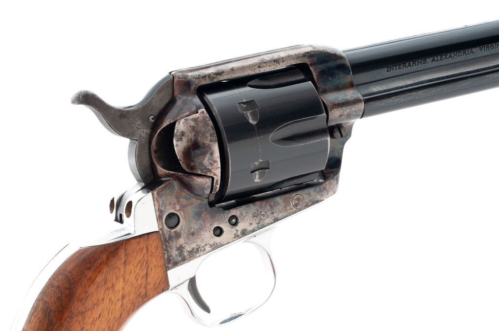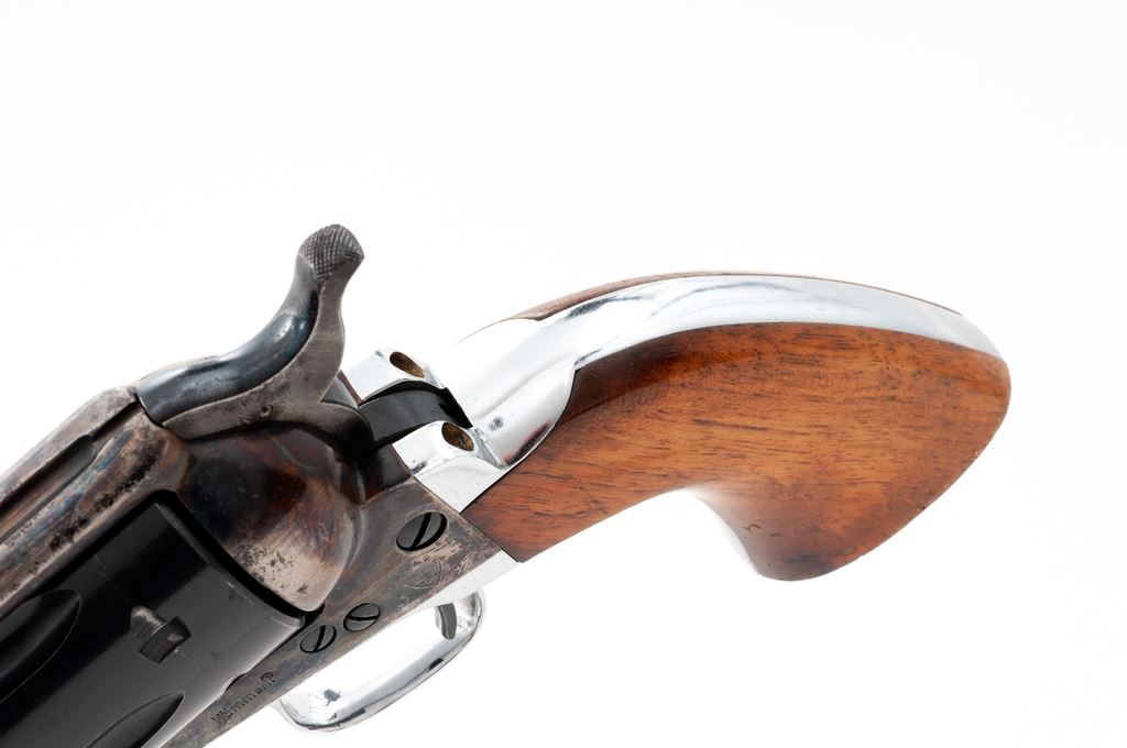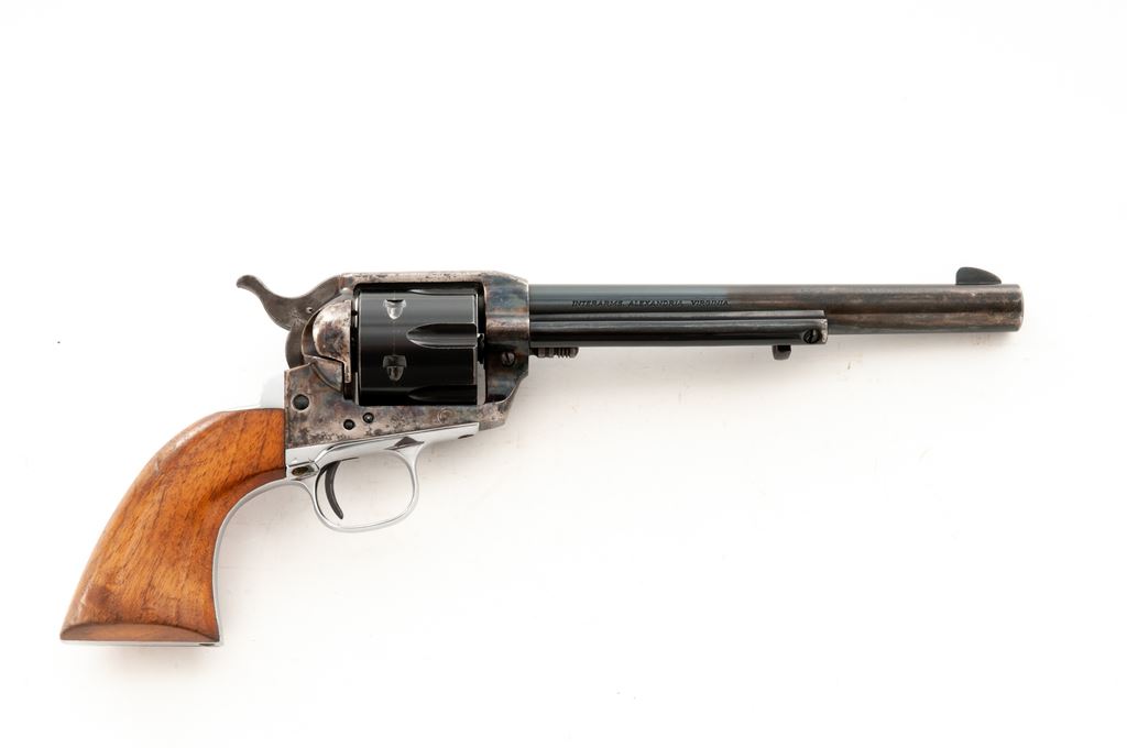 Hammerli Virginian Single Action Revolver, #C1986, .357 mag. cal., 7.25'' barrel, blue barrel and cylinder, case hardened frame, nickel triggerguard and grip strap, with smooth wood grips. Left side of frame is marked ''Swiss Cross'' and ''Hammerli''. Imported by Interarms and marked on the barrel. Condition is very good. Case colors with moderate thinning and some dark spotting mainly to the edges. Front 3-1/2'' of barrel has been cleaned and had finish added over scattered light pitting; pitting is mainly present on right side of barrel. Grips with light marks from handling. Action is crisp, bore is bright and in excellent condition. Est.: $250-$450. (Modern/PPT)