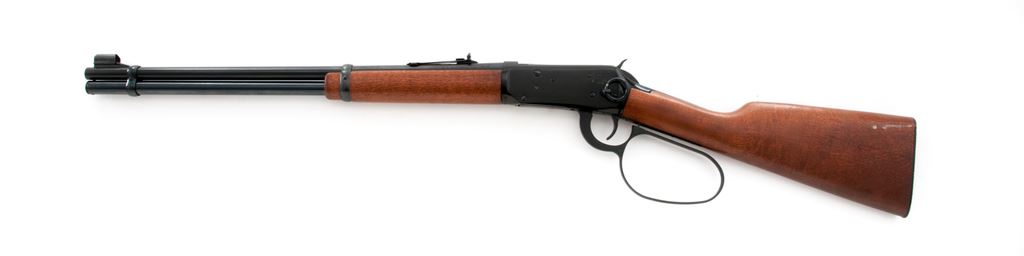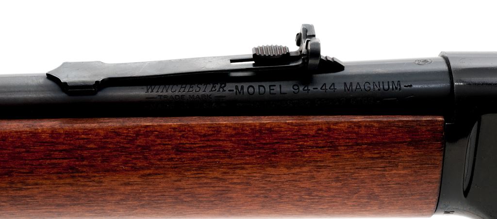 Post-64 Winchester Model 94 Lever Action Carbine, #3206916M, .44 mag. cal., 20'' barrel, blue finish, birch stock, large loop lever, with saddle ring. Condition is excellent showing just light marks from handling and some possible light use. Metal surfaces retain approx. 98% original blue. Stocks with very mild impressions. Good action, bright bore. Est.: $500-$750. (Modern)