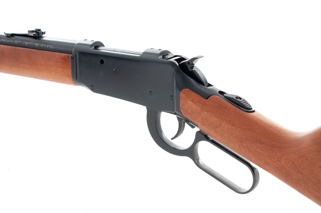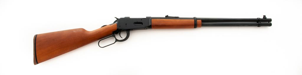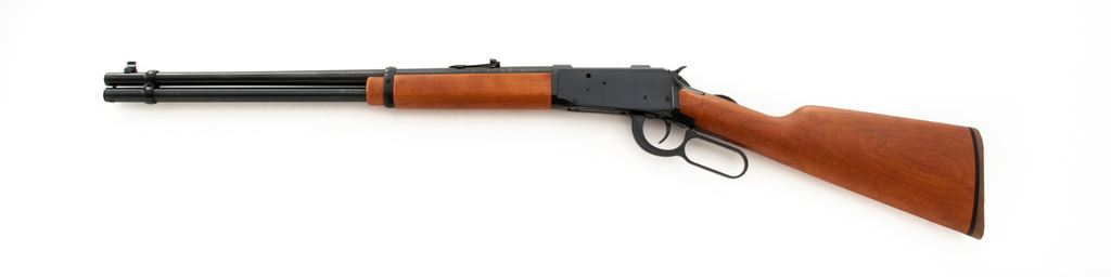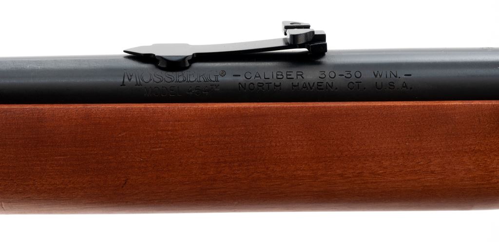 Mossberg Model 464 Lever Action Carbine, #LA008230, .30-30 cal., 20'' barrel, blue finish, birch stock, rubber butt pad, with tang safety, standard gold bead and elevator rear sight. Condition is excellent, appearing as new and unfired. Est.: $300-$500. (Modern)