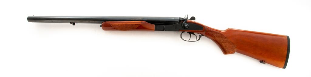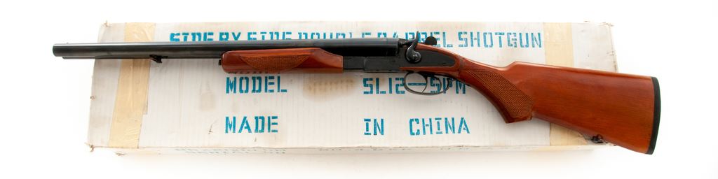 Intrac Arms SL12 Side-by-Side Coach Shotgun, #97000698, 12 ga., 2-3/4'' chamber, 20'' barrels, choked IM/Cyl., dark blue finish, checkered pistol-grip wood stock and forend, factory black rubber pad, sling swivels, exposed hammers, and double triggers. In original box with owner's manual and two-piece styrofoam insert. Mfg'd in China by Norinco. Condition is very good with approx. 96% factory finish, showing light handling marks to the wood and metal. Finish along a portion of top edge of buttstock has started to blister. Action is smooth, bright bores rate excellent. Est.: $150-$250. (Modern)
