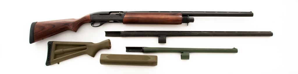 Remington Model 1100 Semi-Automatic Shotgun, #L940957V, 12 ga., 26'' vent rib barrel for 2-3/4'' shells choked Skeet, matte finish, laminated press checkered stock and forend, with black rubber factory butt pad. Also includes a green tactical plastic stock and forend, and one cerakoted 18.5'' round barrel choked Cyl., as well as a 30'' vent rib barrel choked Full. Condition is near excellent. Shotgun shows little use, with the exception of several minor nicks to triggerguard, which only affect the finish and not the metal. Two very small scuffs at bottom portion of forend tip; rear sling swivel has been removed. Good action, bright bore. Choate made composite stock and forend with just minor scuffs. 18.5'' barrel shows very light use to bore but is mostly bright; 30'' barrel is excellent with some external scuffs, most of which should clean. Est.: $450-$650. (Modern)