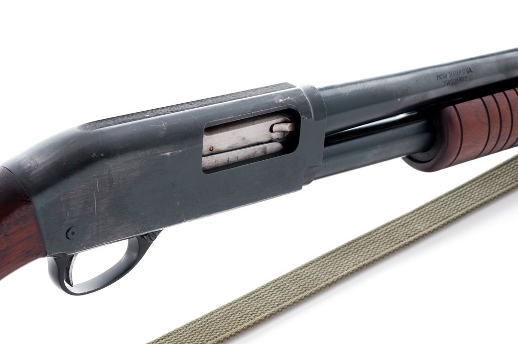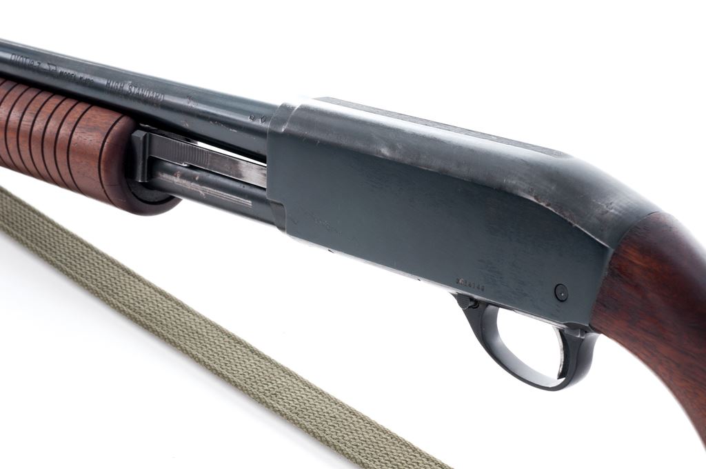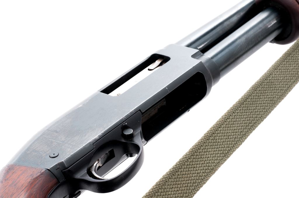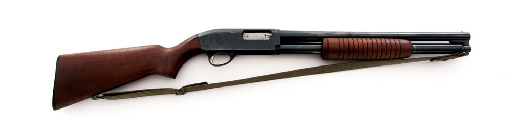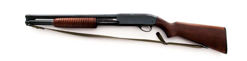 High Standard Riot 18-7 Pump Action Shotgun, #3014148, 12 ga., 18'' barrel, blue finish, walnut stock and forend, with green canvas sling. Also referred to as a Model K-120. Condition is very good retaining approx. 85%-90% blue. Stock shows only very light marks. Crisp action, bright bore. Est.: $250-$400. (Modern)
