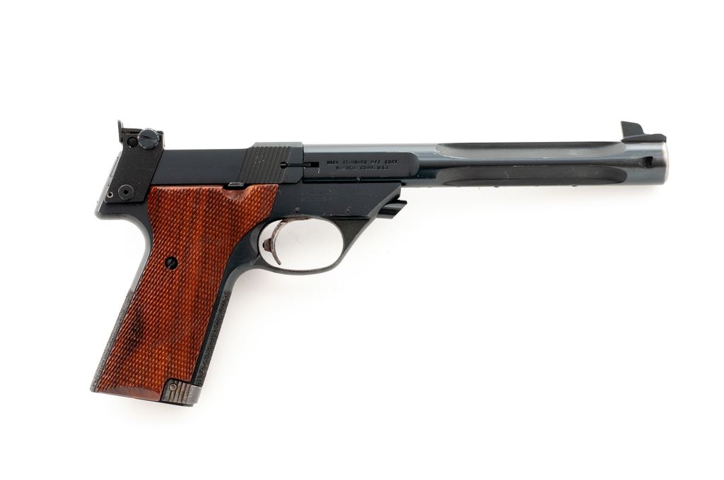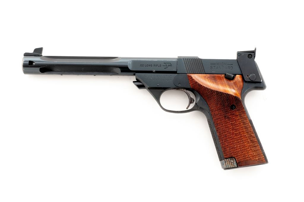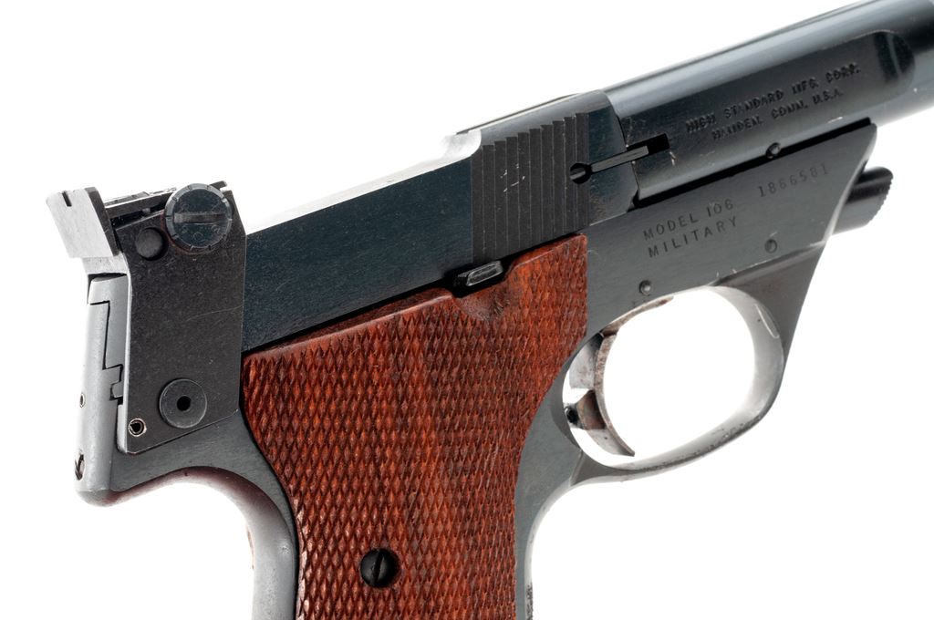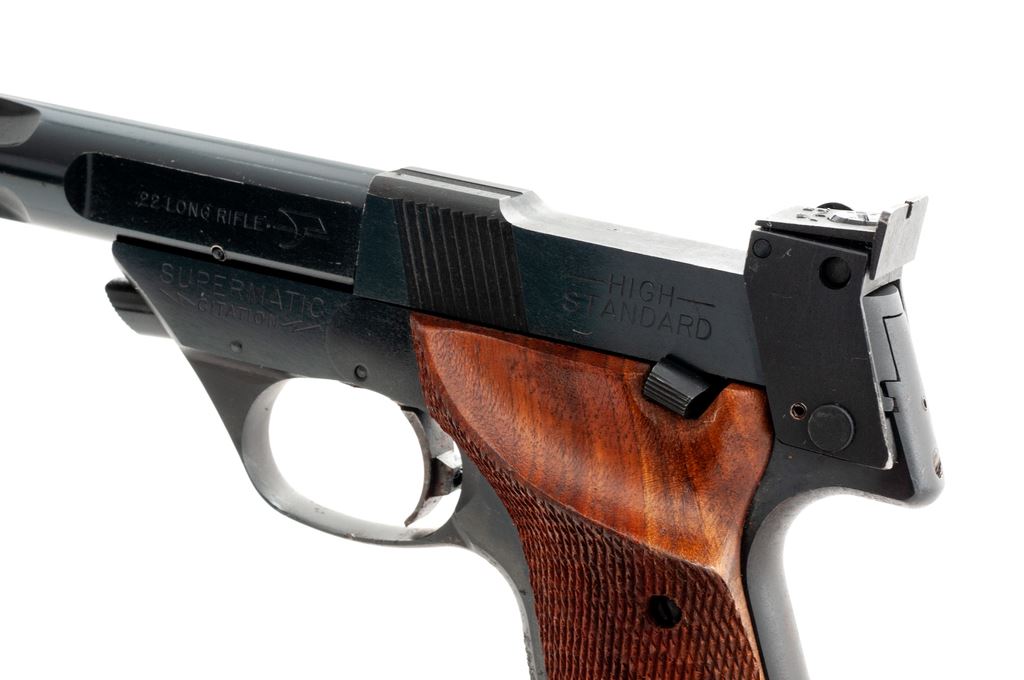High Standard Supermatic Citation (Model 106 Military) Semi-Automatic Target Pistol, #1866581, .22 LR cal., 7.25'' fluted barrel, blue finish, factory checkered thumbrest walnut grips, with one factory magazine. Condition is excellent retaining approx. 97%+ original blue. Grips with very light wear. Good action, bright bore. Est.: $450-$650. (C&R/PPT)