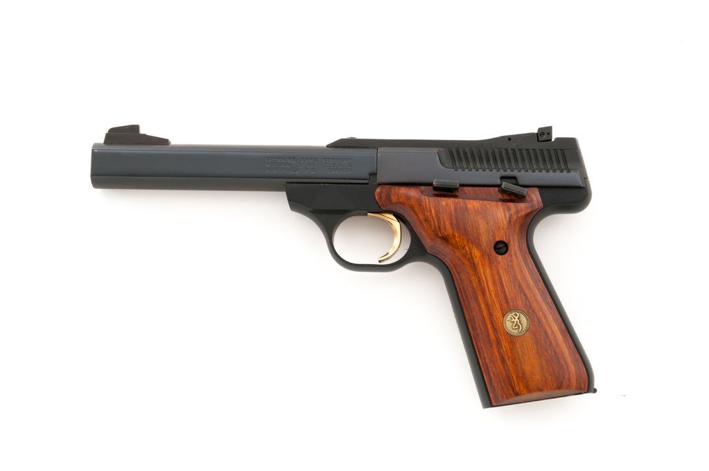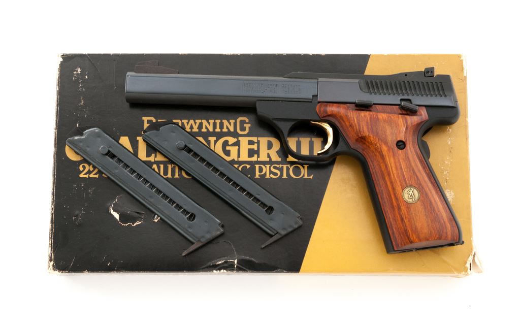Browning Challenger III Semi-Automatic Pistol, #655PX07523, .22 LR cal., 5.5'' bull barrel, blue finish, black alloy frame, smooth wood grips with gold Browning medallions, gold-colored trigger, fixed blade front sight, fully adjustable square notched rear sight, and includes three (3) factory 11-shot magazines. In original box that is numbered to the gun, styrofoam insert, and owner's manual. In excellent overall condition with approx. 99%+ original finish remaining; barrel with some minor handling marks; slide has toned to a light plum color. Grips also appear near new. Action is smooth; bore is bright. Box shows mostly moderate storage wear with a few penetrations to the top section. Est.: $300-$400. (Modern/PPT) (High-caps mags not available to Calif. residents.)