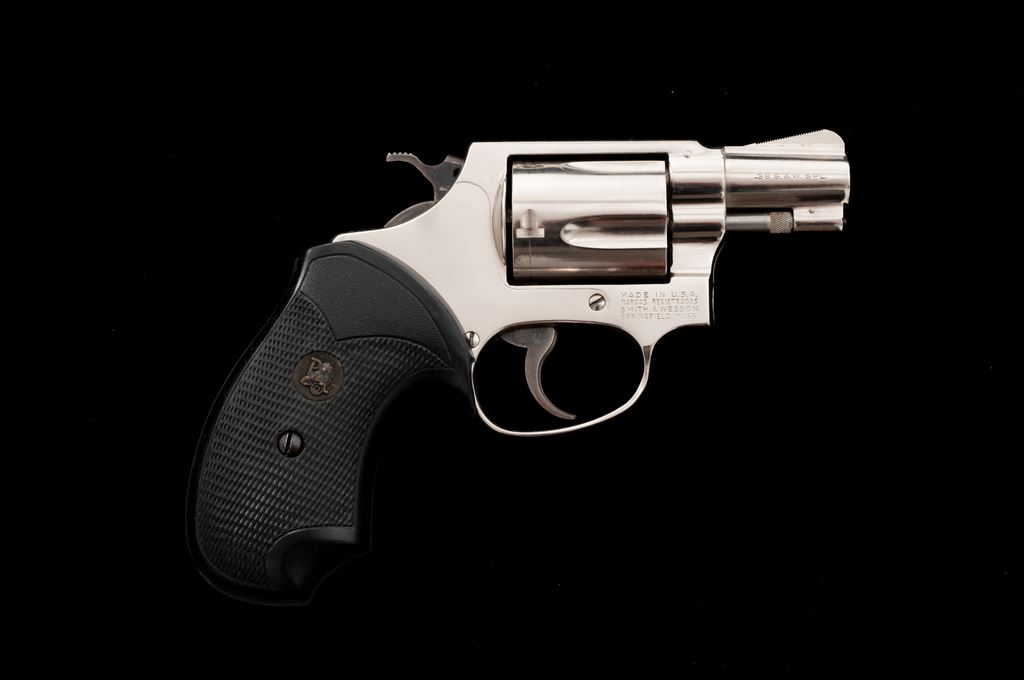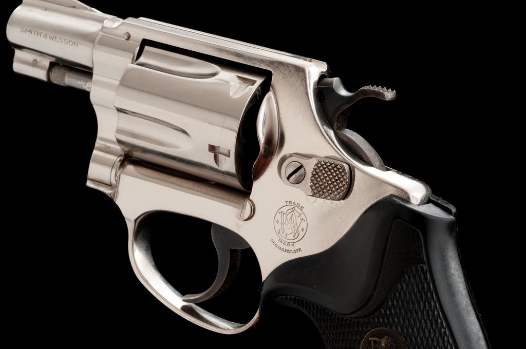 Smith & Wesson Model 36 Chief's Special Double Action Revolver, #J527673, .38 special, 1-7/8'' barrel, bright nickel finish, checkered black rubber Pachmayr grips, case hardened hammer and trigger, with standard sights. Condition is very good showing general slight micro-scratching to the bright nickel finish. Factory lettering is clear and crisp. Cylinder with a moderate index line. Grips show normal light handling marks, checkering shows no mentionable wear. Approx 90% case colors remain with a little fading to right side of trigger. Excellent action with a smooth hammer and trigger; bore is near excellent. Est.: $300-$500. (Modern/PPT)