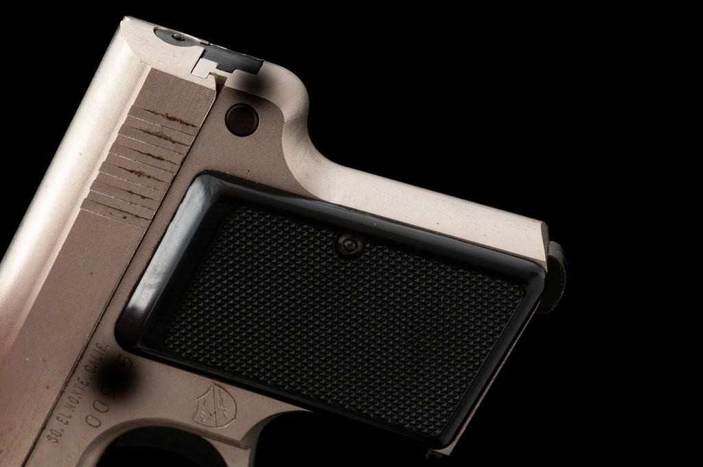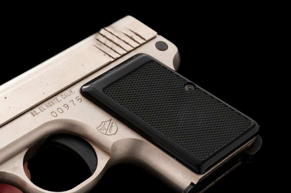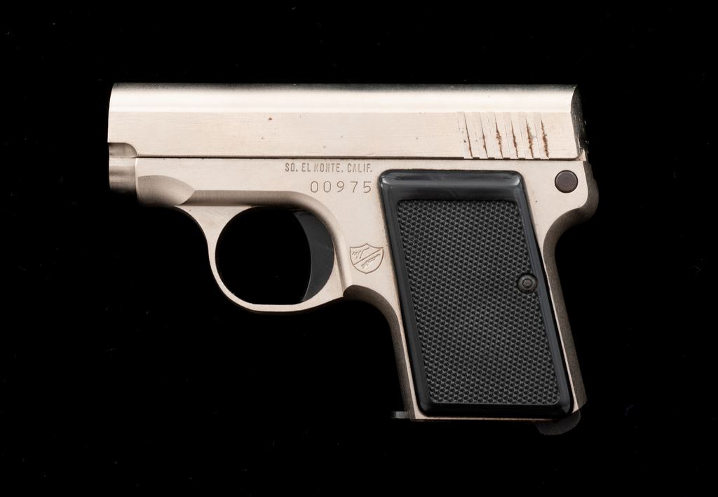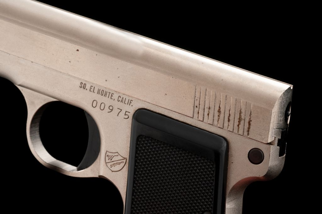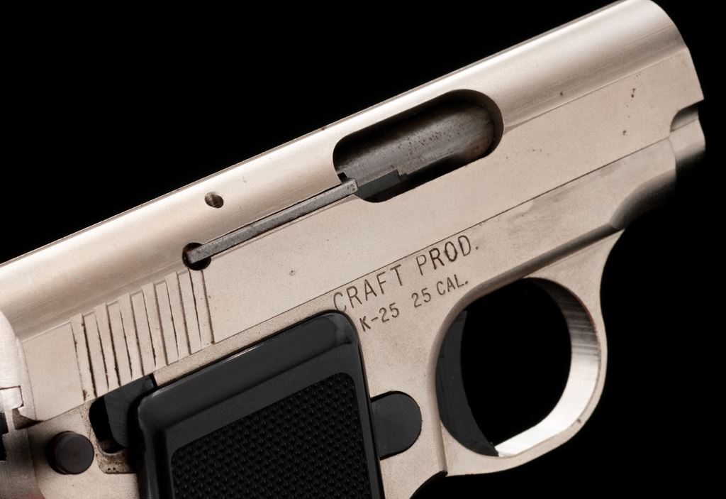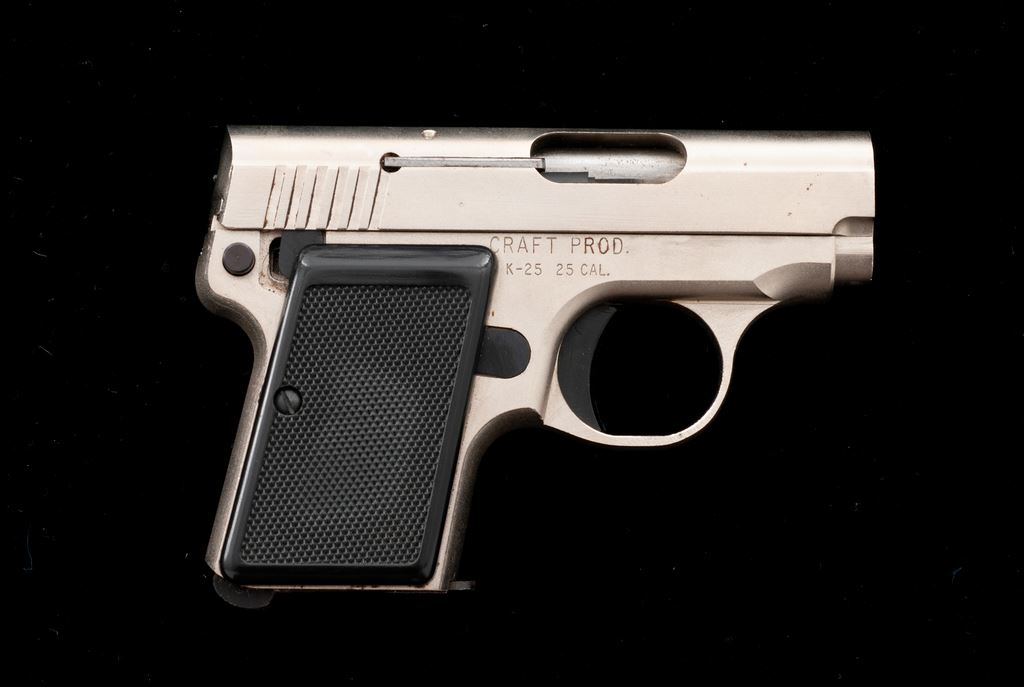 Craft Products Model K-25 Semi-Automatic Pistol, #00975, .25 ACP cal., 2-1/4'' barrel, satin nickel finish, checkered black plastic grips, with one blued steel magazine. Left side of frame is marked ''SO. EL MONTE, CALIF.''; left side also with a shield logo that contains a ''W'' in the upper half, and a ''rifle'' in the lower half. Metal rates excellent with intermittent tiny dark specks to the finish; left side slide serrations with some light oxidation. Grips are excellent, no chips or cracks. Factory lettering is clear and shows no mentionable wear. Action is smooth with an excellent bore. Est.: $100-$200. (Modern/PPT)