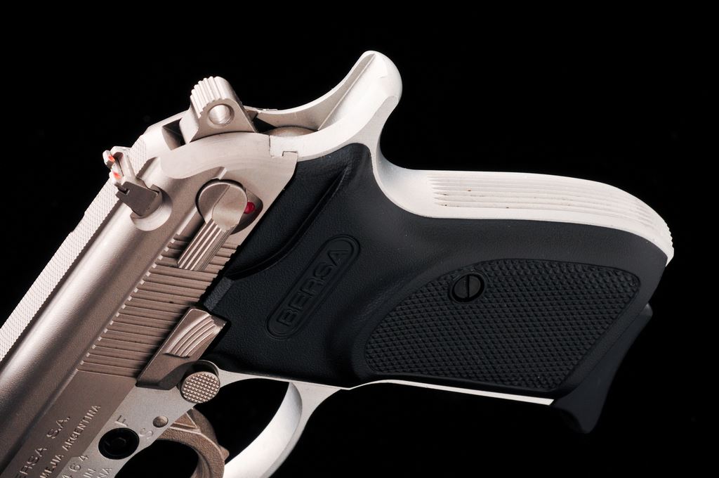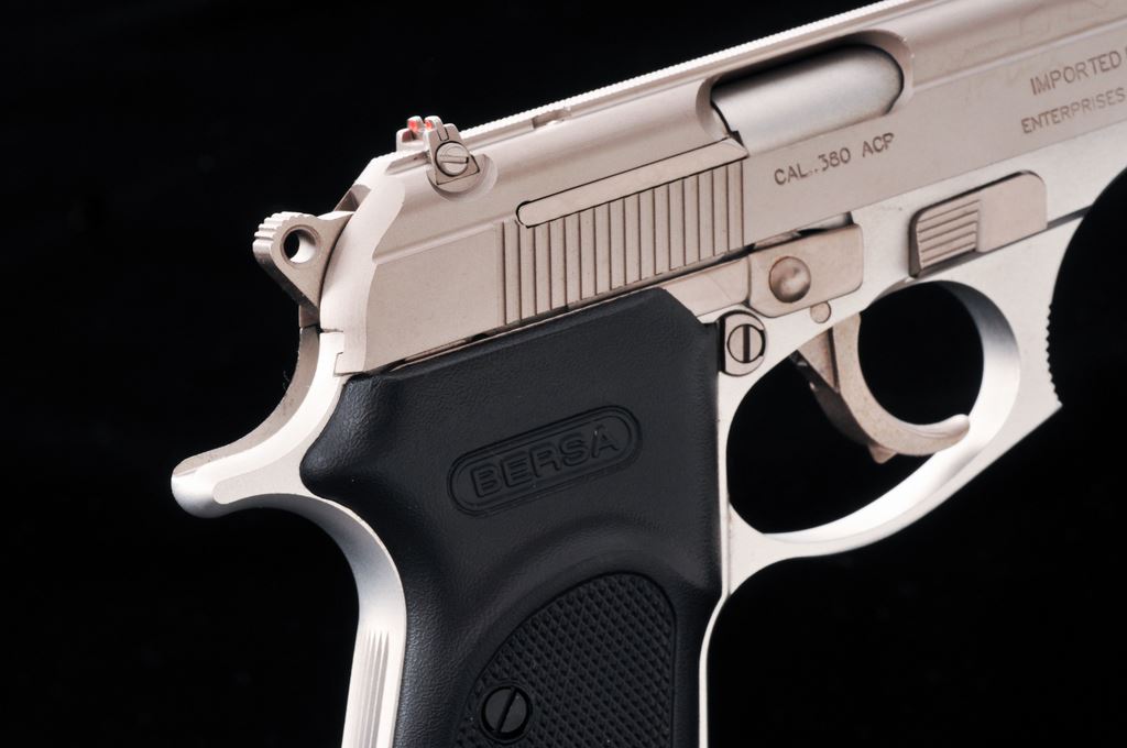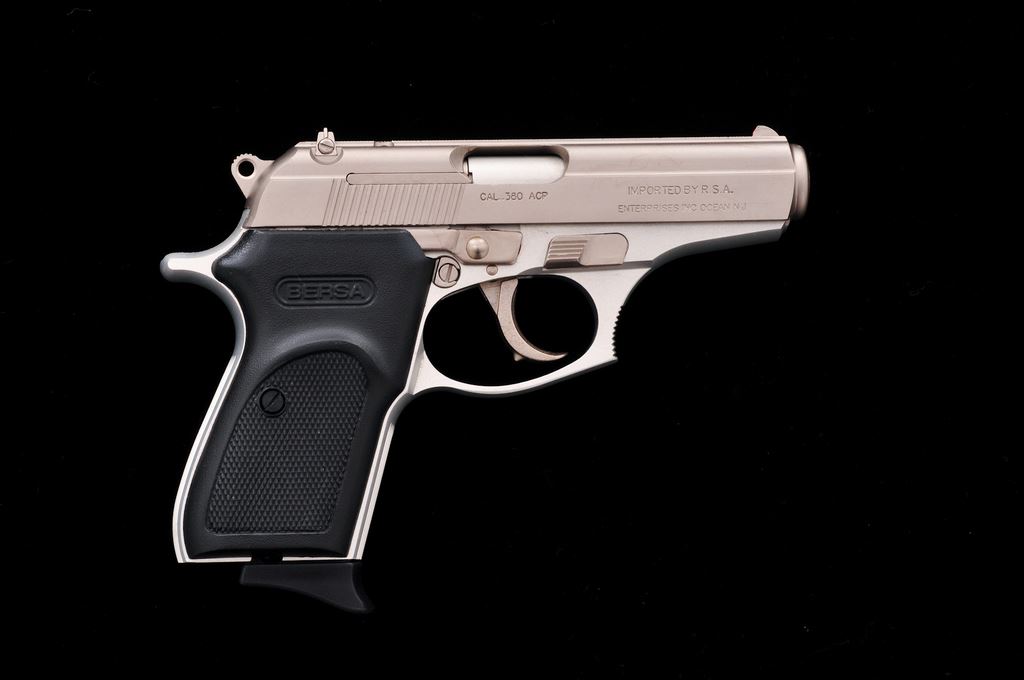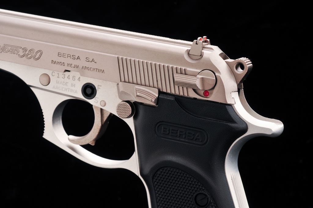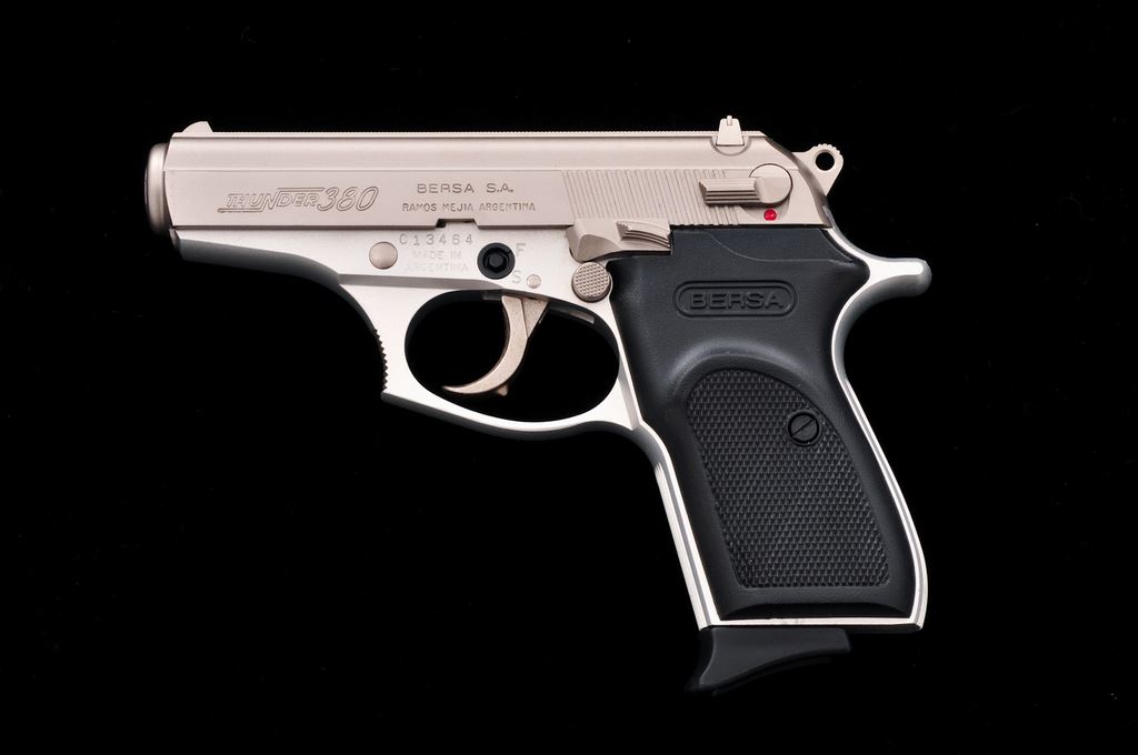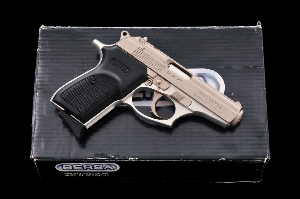 New Bersa Thunder 380 Semi-Automatic Pistol, #C13464, double action, .380 ACP cal., 3-5/8'' barrel, satin nickel finish, factory checkered black plastic grips, orange 3-dot sights; rear sight is adjustable for windage. Pistol also features a serrated front and back strap, decocking lever, and one factory blued steel magazine with black plastic finger extension. Included is the box with matching end label, owner's manual, safety key, gun lock, and other misc. factory paperwork. Triggerguard with the original red ''warning'' hang tag still in place. Condition is excellent appearing brand new and unfired since leaving the factory. Est.: $200-$300. (Modern) (Not available to Calif. residents.)