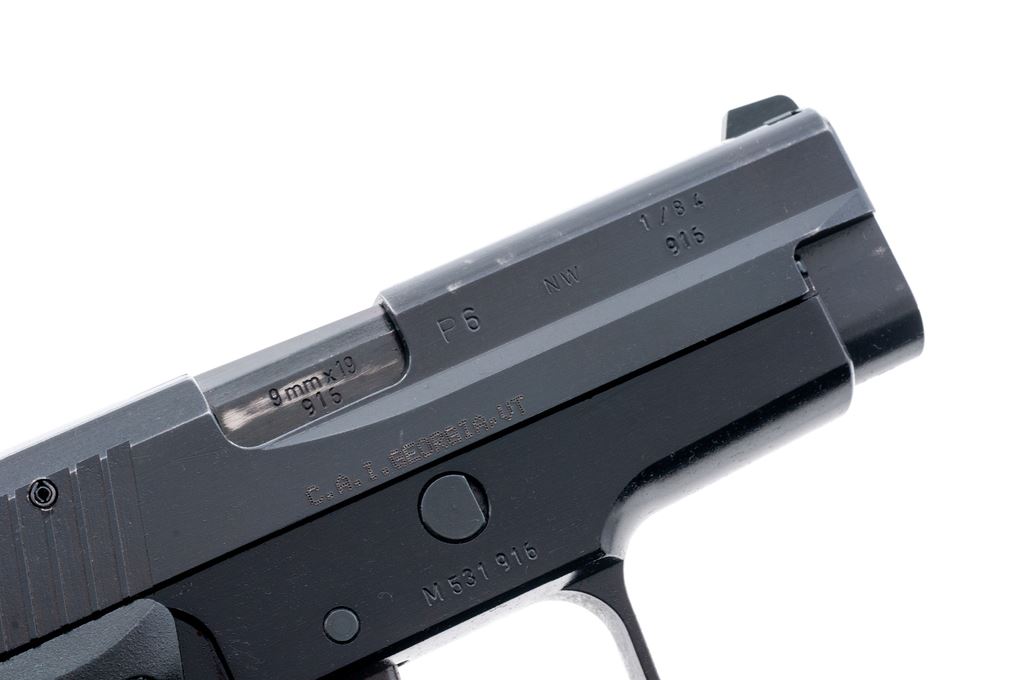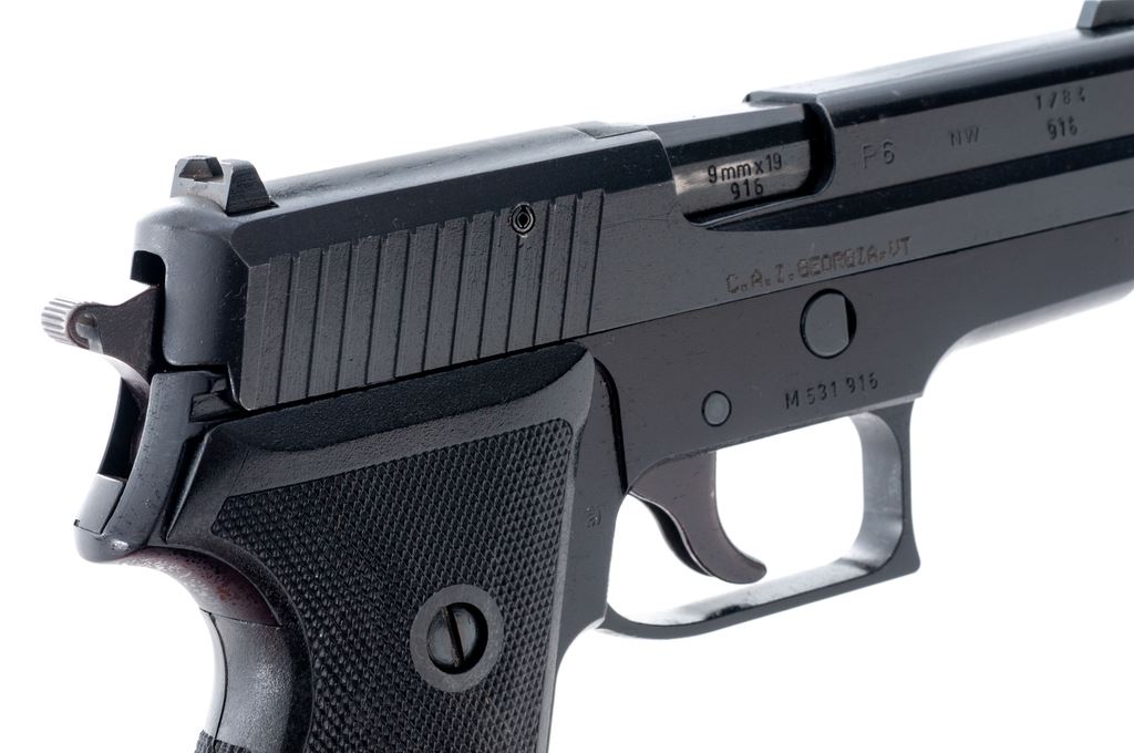 German Police Marked Sig Sauer P6 Semi-Automatic Pistol, #M531916, 9mm cal., double/single action, 3.75'' barrel, blued steel slide, black frame, checkered black plastic grips, standard fixed sights, no magazine. Right side of slide is marked ''P6'', ''NW'', and ''1/84 / 916''; left side ''MADE IN W. GERMANY''. Imported by CAI and so marked on right side of slide. Pistol rates as fine overall with approx. 95%-97% original finish, showing normal light handling marks, slide with some high edgewear and one light 3/8'' scratch to left side. Grips show age and wear consistent with the rest of the pistol; checks with no mentionable wear. Factory lettering is clean and clear. Action is smooth, bore is bright. Est.: $300-$500. (Modern/PPT)