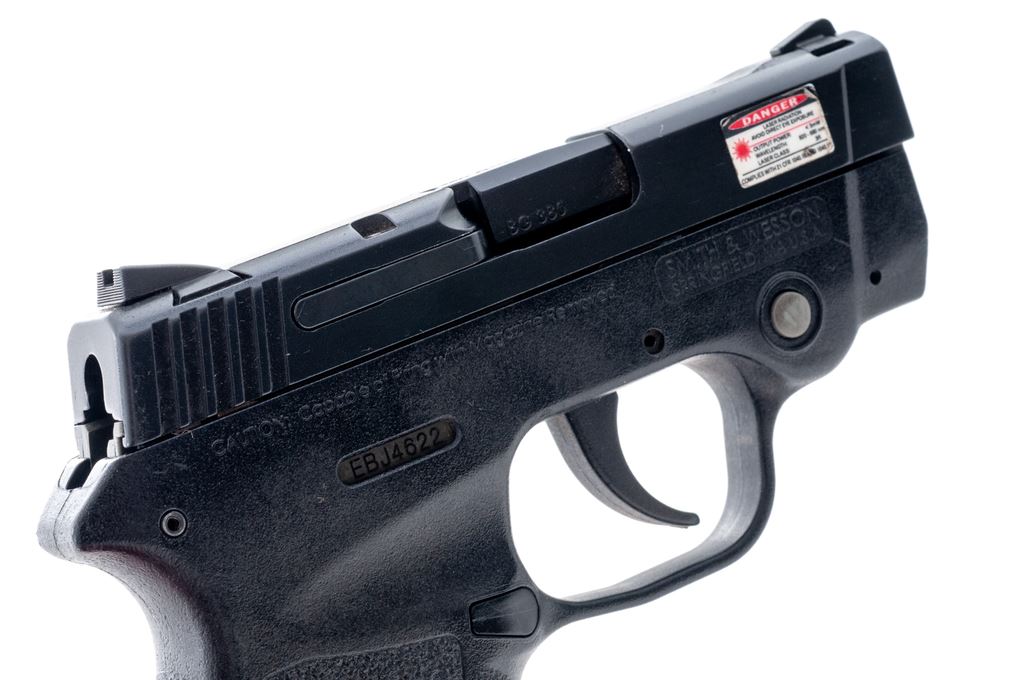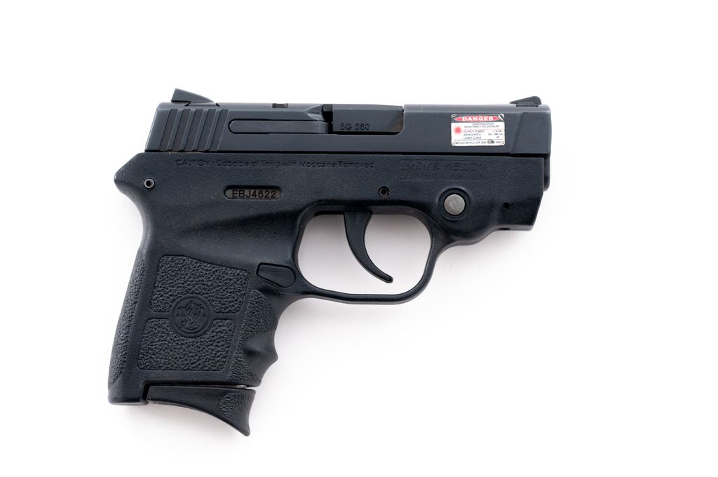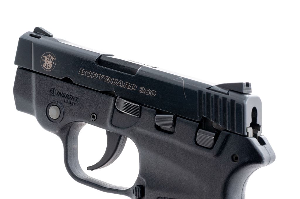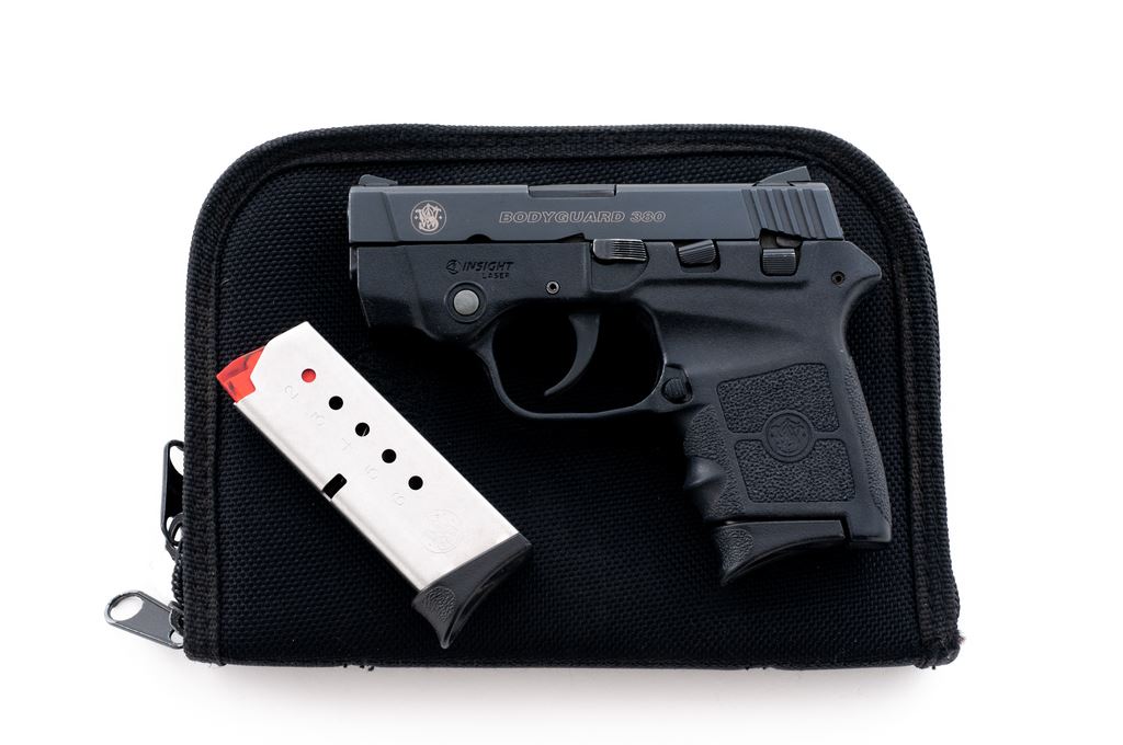 Smith & Wesson M&P Bodyguard .380 Semi-Automatic Pistol, #EBJ4622, double action, .380 ACP cal., 2.75'' barrel, black slide, black composite frame with built in Insight laser, and standard fixed sights. Included are two (2) 6-shot factory S&W magazines and padded black nylon Cordura S&W carry pouch. Condition is excellent with a few normal small handling marks. Smooth action, near excellent bore. Laser functions properly. Est.: $175-$275. (Modern)(Not available to Calif. residents.)