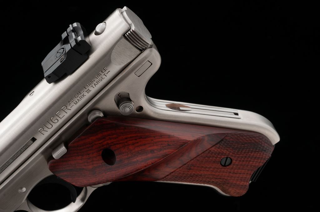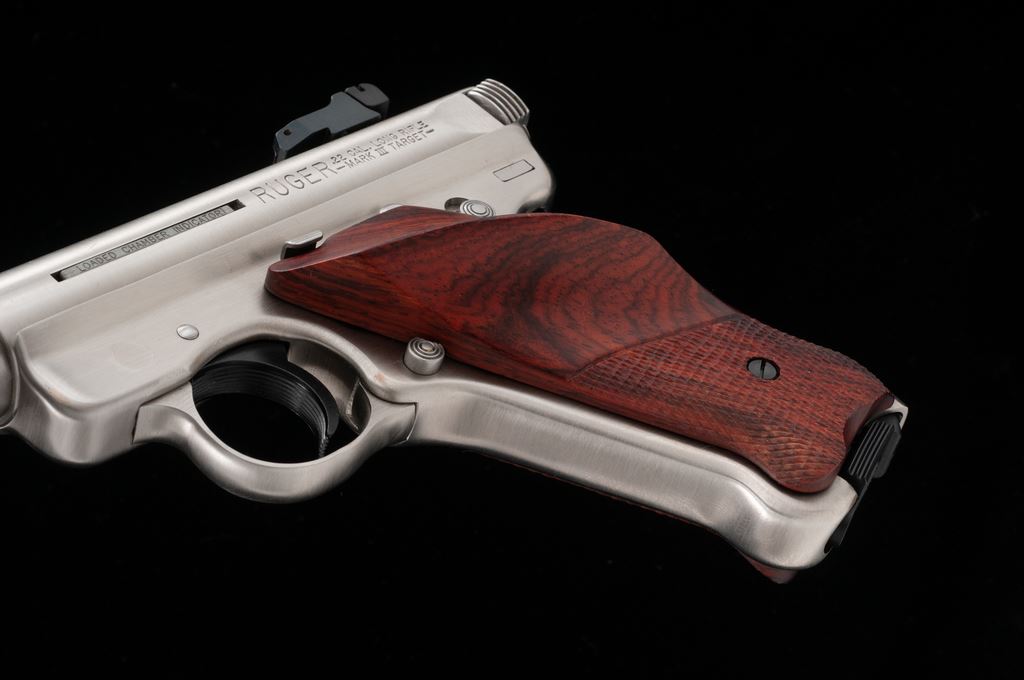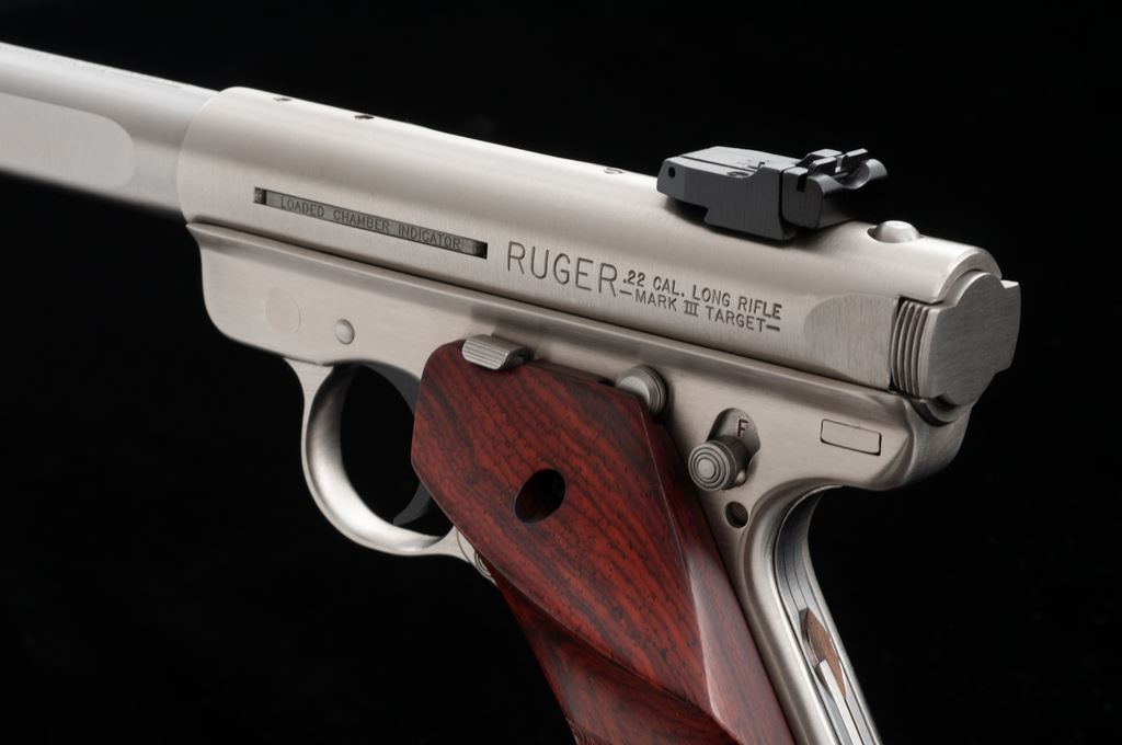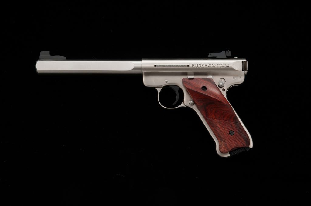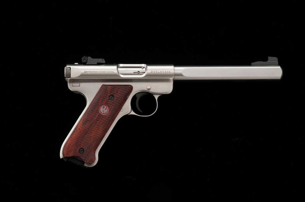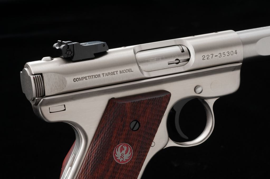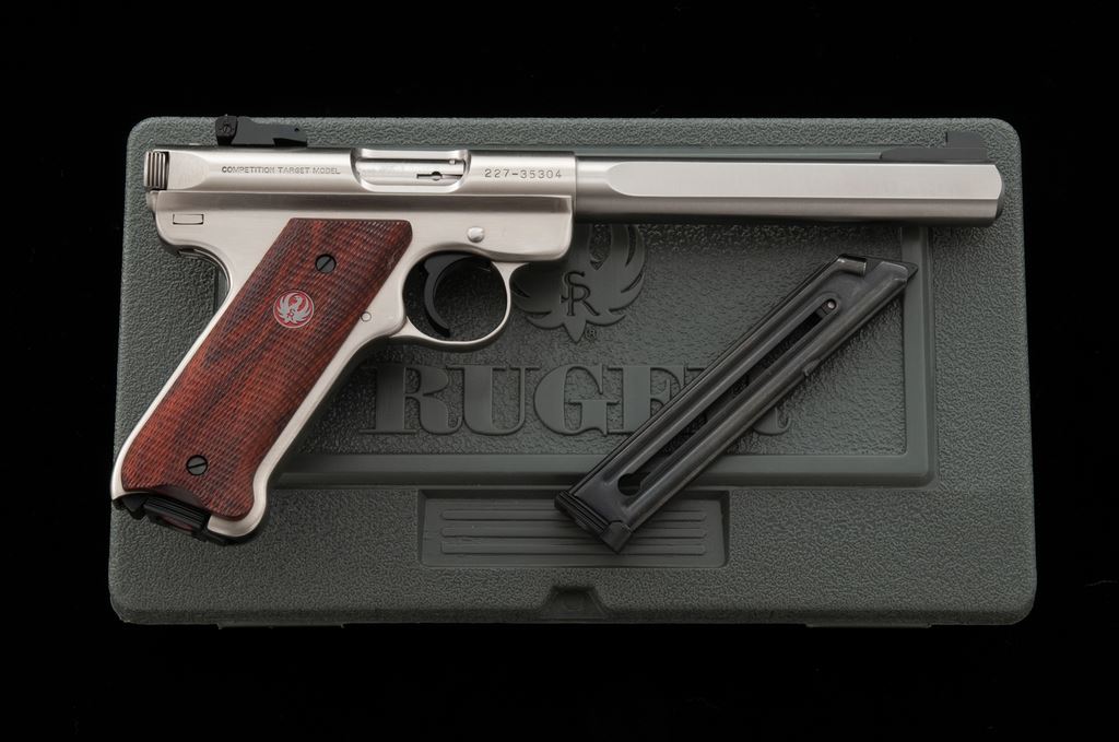 Ruger Mark III Competition Semi-Automatic Pistol, #227-35304, .22 LR cal., 6-7/8'' slab-sided bull barrel, satin stainless steel, checkered wood thumbrest grips, Patridge front sight, fully adjustable rear sight, with two (2) factory magazines. In original plastic case numbered to the gun, with owner's manual, scope base, gun lock, and two (2) internal safety keys. Condition is excellent. Metal with a small amount of scattered light scratches from range use. Grips appear near new, checkering shows no mentionable wear. Excellent action and mirror bright bore. Overall a nice lightly used pistol. Est.: $350-$500. (Modern/PPT)