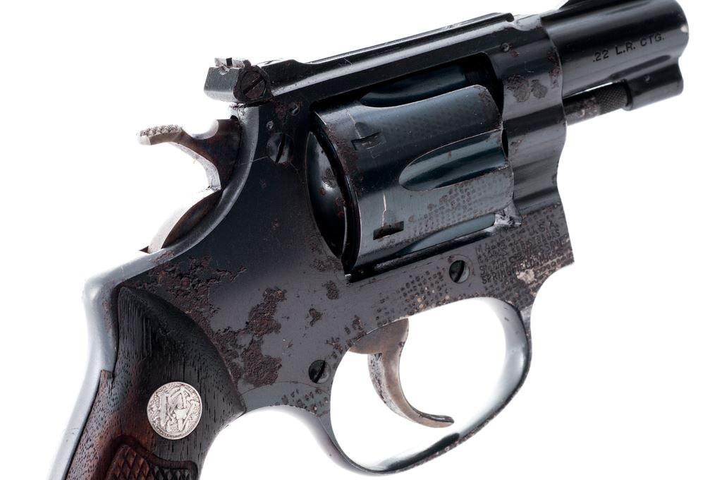 Smith & Wesson Model of 1953 .22/32 Kit Gun ''Pre-Model 34'' Double Action Revolver, #9963, .22 LR cal., 2'' pinned barrel, blue finish, checkered walnut diamond center grips with silver S&W medallions, serrated ramp front sight, micrometer click adjustable rear sight, with case hardened hammer and trigger. Metal with considerable surface rust and pitting, heaviest on the right side. Grips with dark staining. Action is crisp, bore is very good. A thorough cleaning would probably improve the overall condition. Externally showing water damage, mechanically it seems fine. Est.: $200-$300. (C&R/PPT)