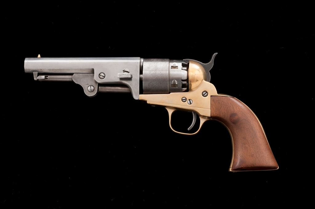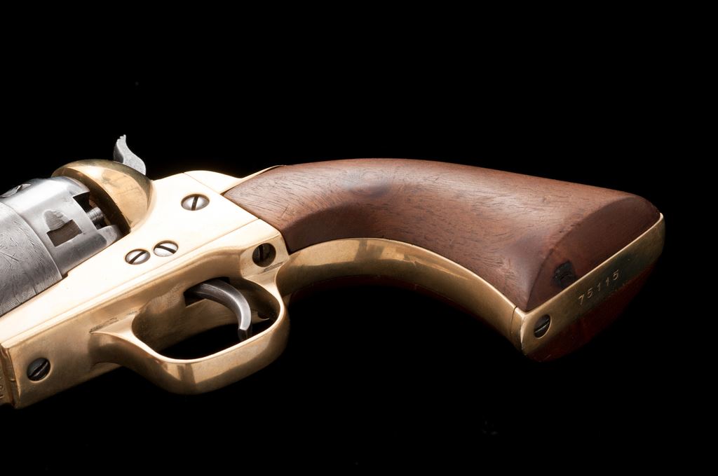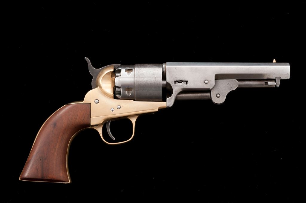 Reproduction Colt Navy Type Percussion Revolver, #75115, .44 cal., unmarked 5'' octagonal barrel, round rebated cylinder with roll-engraved scene of a naval battle, brass frame with various proofmarks on underside at serial number, plain one-piece walnut grips. All visible serial numbers match. Condition is fine as apparently left unfinished from the factory, having clean metal surfaces, sharp edges and clear cylinder engraving. Action is smooth and crisp; bore appears clean with sharp rifling. Est.: $250-$450. (Antique)