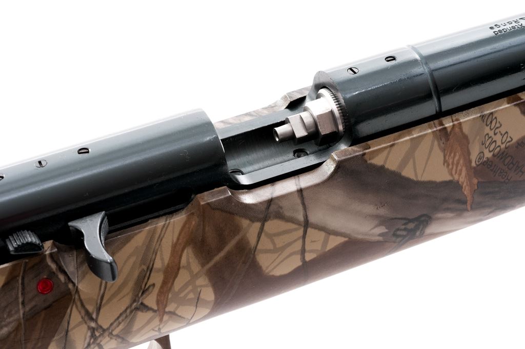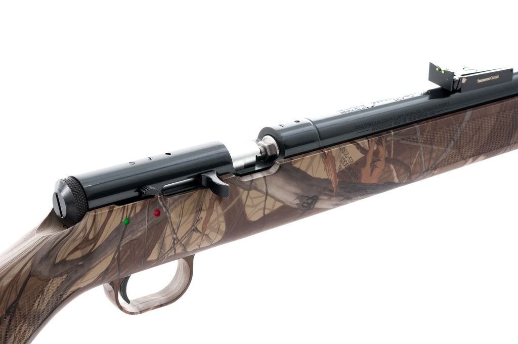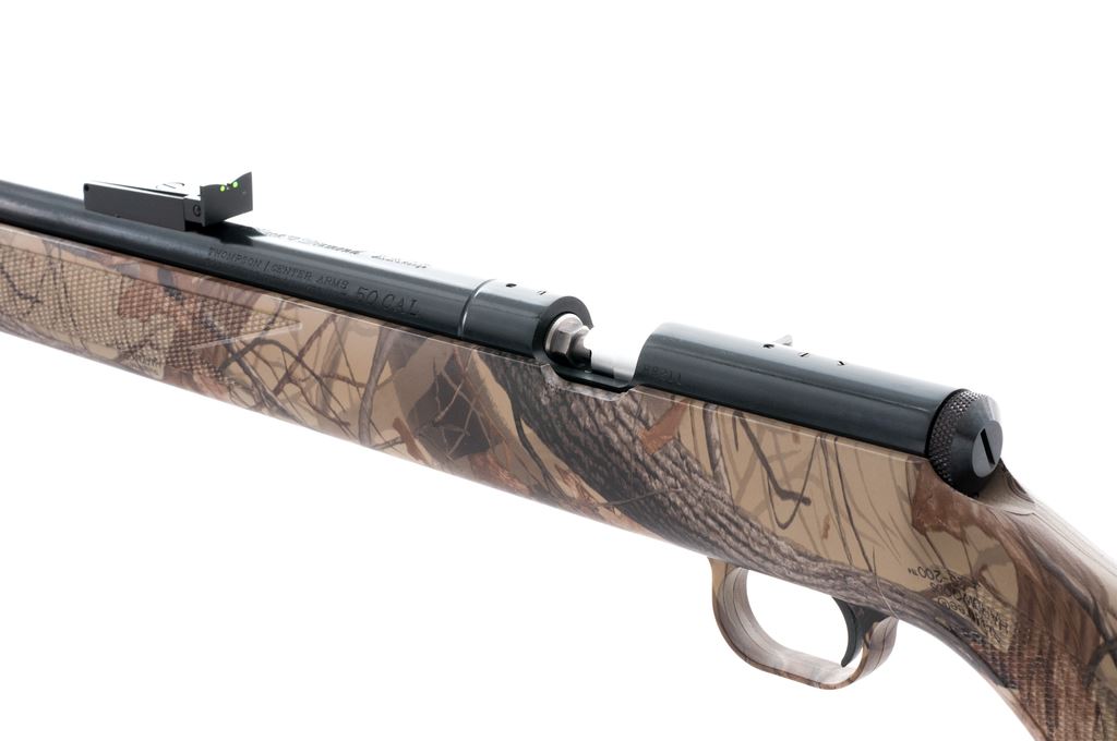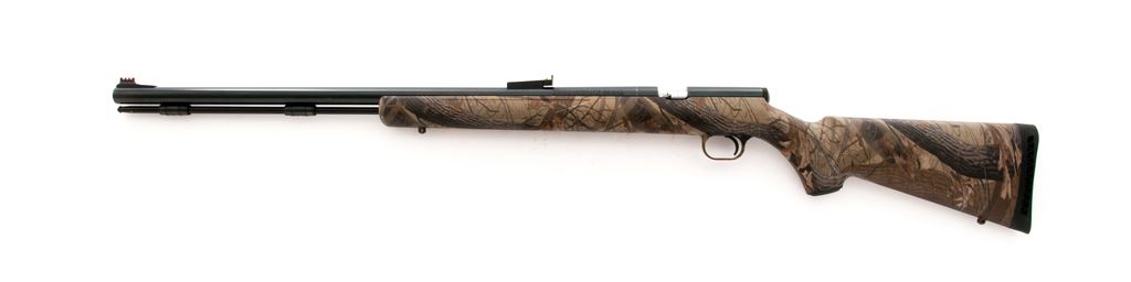 Thompson Center Arms Black Diamond XR In-Line Muzzle-Loading Rifle, #R9211, .50 cal., 26.5'' barrel, dark blue finish, synthetic pistol-grip Realtree ''Hardwoods'' camouflage stock, factory black rubber pad, sling swivel studs, orange fiber optic front sight, and fully adjustable green-dot fiber optic rear sight. Overall condition is excellent with approx. 99% original finish; barrel with a few thin scratches. Stock shows scattered light handling marks. Bolt is tight and smooth; bore is bright with excellent rifling. Est.: $125-$225. (No FFL Required)