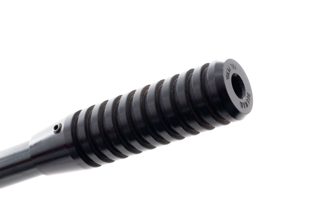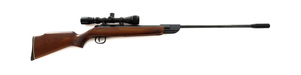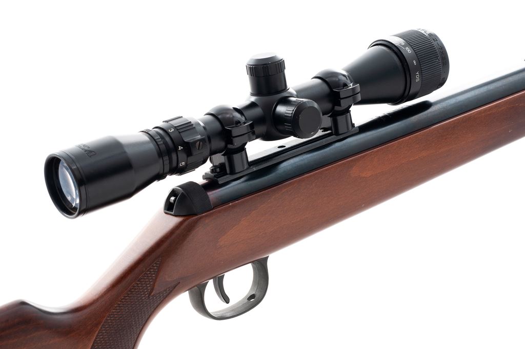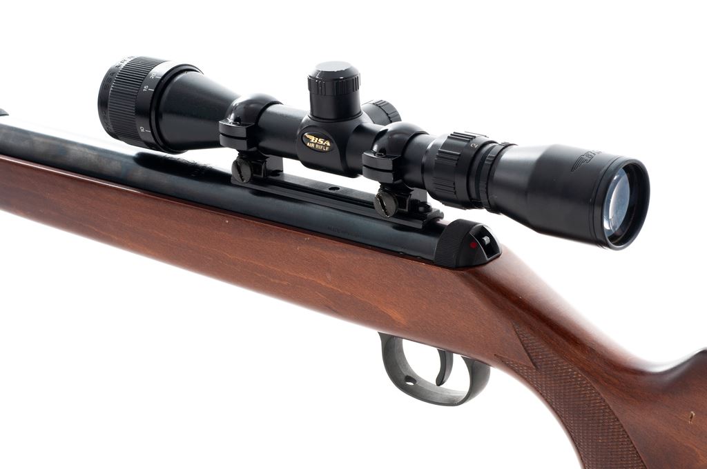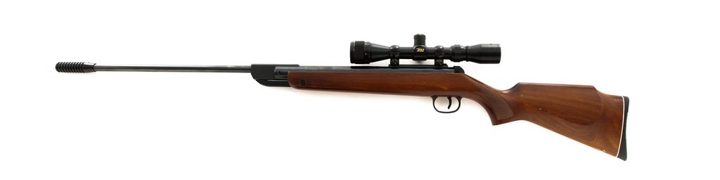 RWS Diana 36 Air Rifle, #01059690, .177 cal., 21.75'' overall barrel length which includes the added barrel weight, blue finish, one-piece wood stock, adjustable trigger, sights have been removed, with a BSA 2-7x32 Air Rifle scope; scope with duplex reticle. Made in Germany. Approx. 98% original finish remains and metal surfaces rate as excellent. Stock is very good with mostly moderate marks from handling and use, most noticeable around the pistol grip; left side of buttstock with a few small but deeper impressions. Break open action is smooth, bore is bright with sharp rifling. Scope is excellent with a few small handling marks to the exterior; optics are clear. Est.: $125-$225. (No FFL Required)