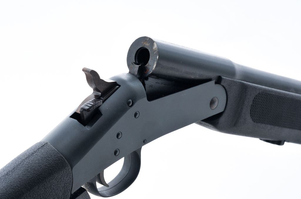 New England Firearms Survivor Single Shot Rifle, #NK228588, .45 LC/.410 bore, 3'' chamber, 20'' rifled blued steel barrel, matte receiver, checkered black synthetic stock with storage compartment in the buttstock, sling swivels, and black nylon Cordura sling. Barrel with a brass bead front sight and screw-in choke; choke tool is included. Condition is excellent with 99% original finish. Metal shows intermittent light handling marks. Synthetic stock with sharp checkering. Excellent action with a smooth hammer and trigger; bore is also excellent with strong rifling. Est.: $175-$275. (Modern)