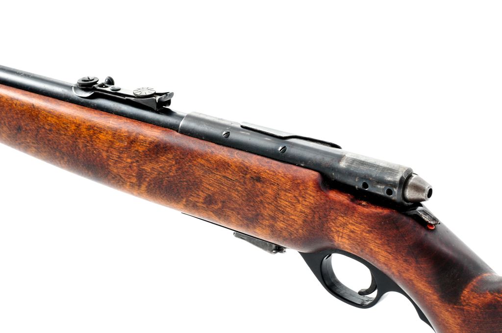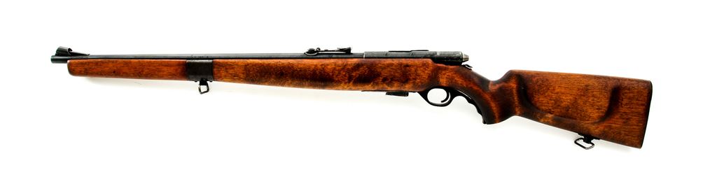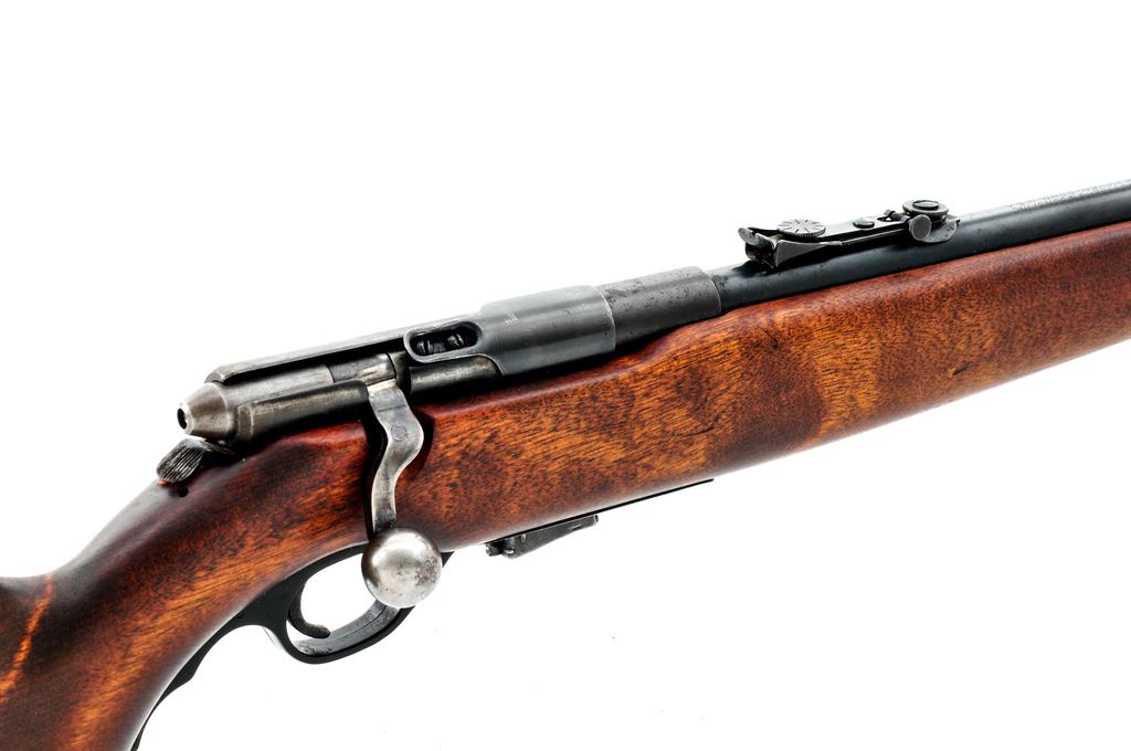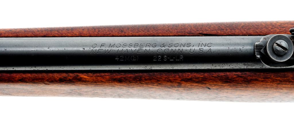 Mossberg Model 42M(b) Bolt Action Rifle, NVSN, .22 cal., 22.8'' barrel, blued finish, walnut stock, blade with protective hood front sight with adjustable leaf rear sight. Stamped on barrel ''O.F.MOSSBERG &SONS, INC., NEW HAVEN, CONN. USA 42M(b) 22 S-L-LR''. Detachable magazine is included. Condition overall is very good, with approx. 80% finish remaining showing light rust speckling on receiver and barrel. Stock has been sanded and refinished to a flat matte color. Action is smooth, bore is excellent with sharp rifling. Est.: $150-$250. (C&R)