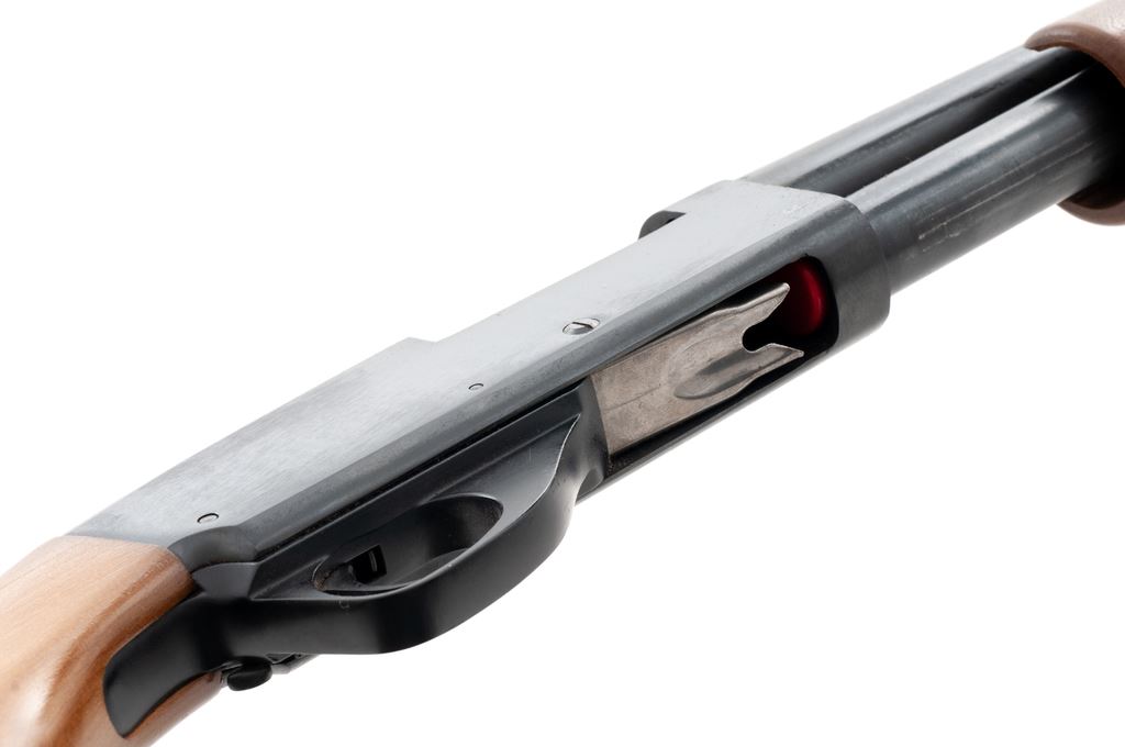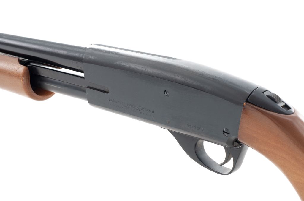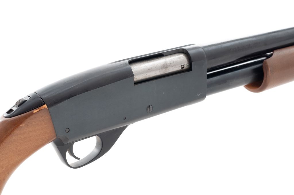 Savage/Springfield Model 67 Series C Pump Action Shotgun, #B247696, 12 ga., 3'' chamber, 28'' barrel, Mod. choke, silver bead front sight, smooth pistol-grip wood stock and forend, with grooved black plastic buttplate. Overall condition is very good+ with approx. 98% original blue finish. Receiver with a few light scratches, the most noticeable being to the left side. Wood with scattered small impressions and scratches, mainly on the grip and forend. Excellent action and bright shiny bore. Est.: $100-$200. (Modern)
