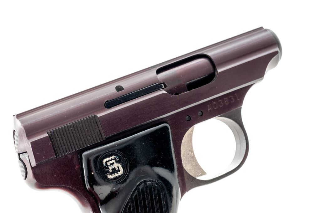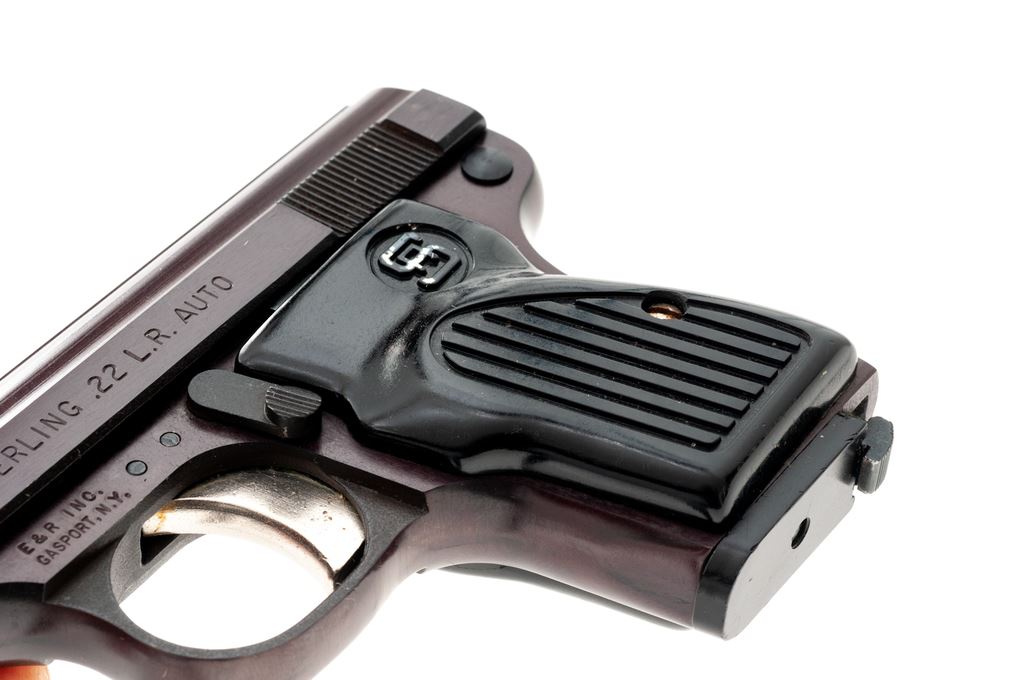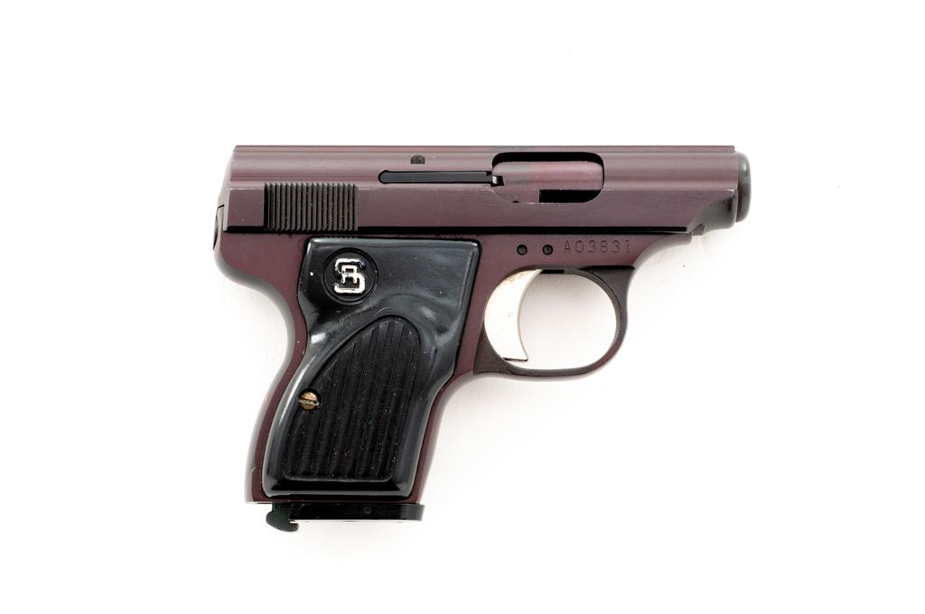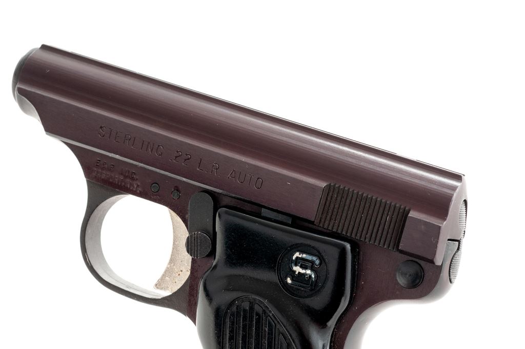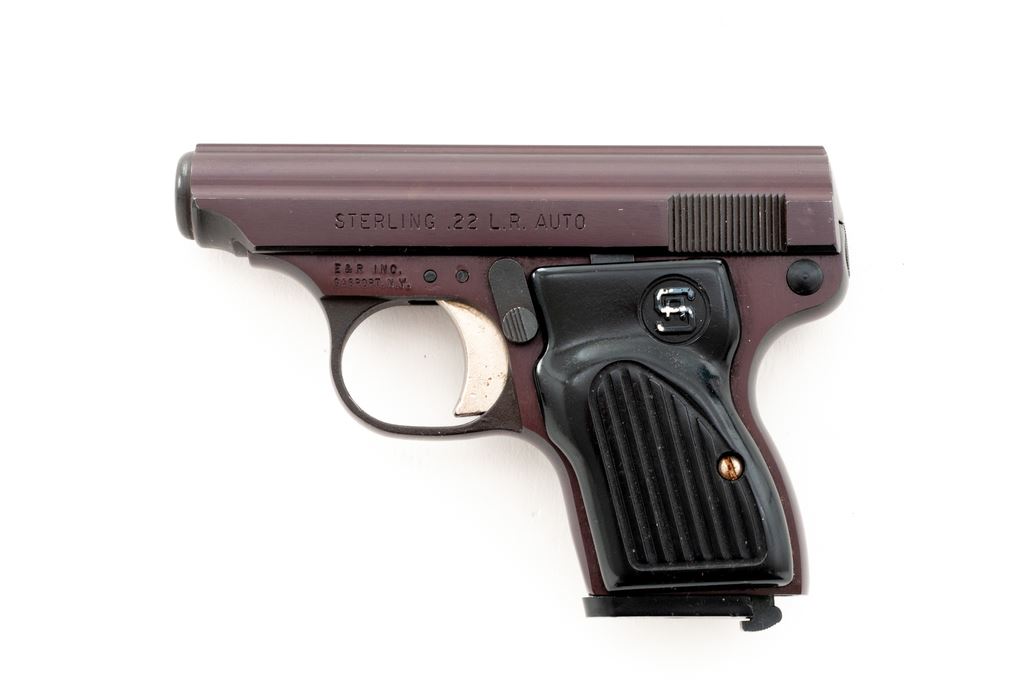 Sterling Arms Semi-Auto Pistol, #A03831, .22 LR cal., 2-3/8'' barrel, plum-colored finish, factory black plastic grips, one magazine with black plastic base. Condition is very good. Grips show moderate handling marks. Action is smooth, bore is excellent. Est.: $100-$200. (Modern/PPT)