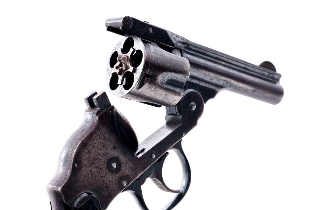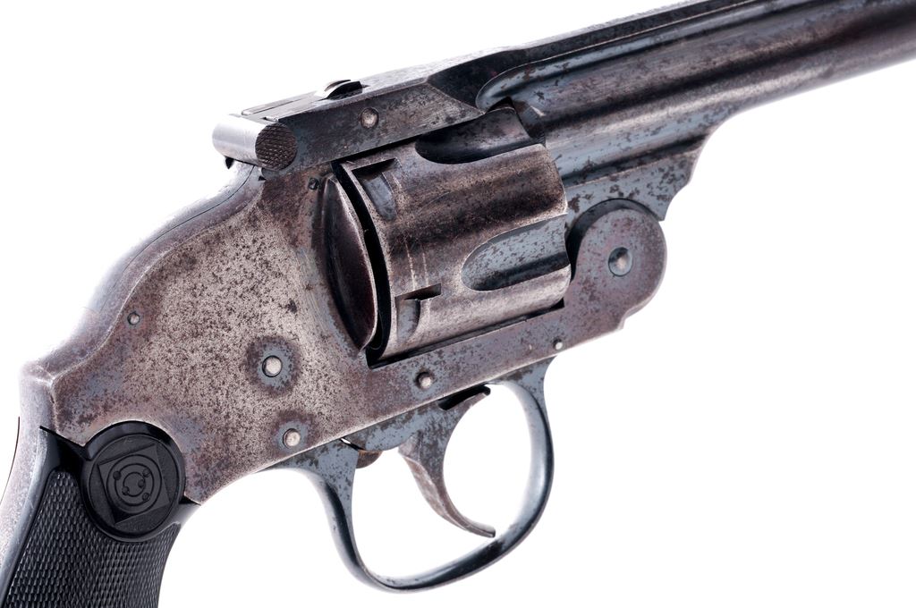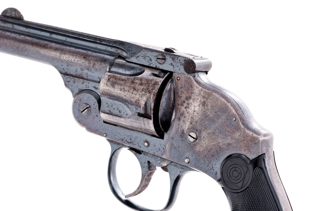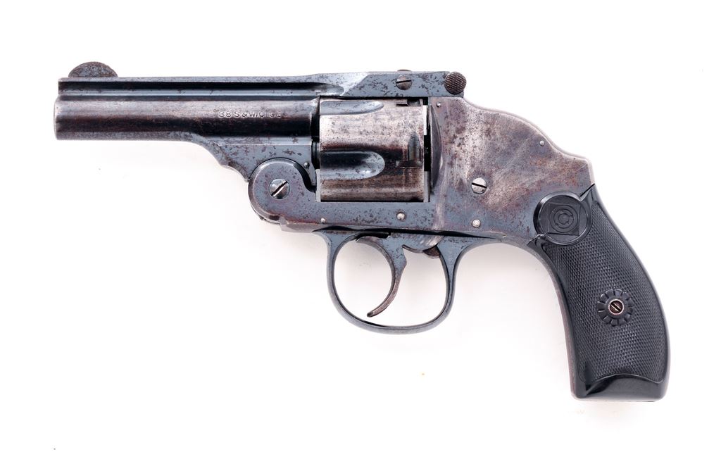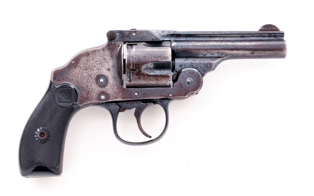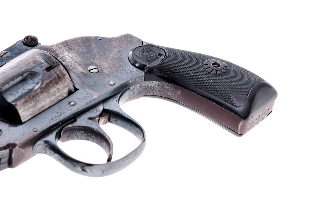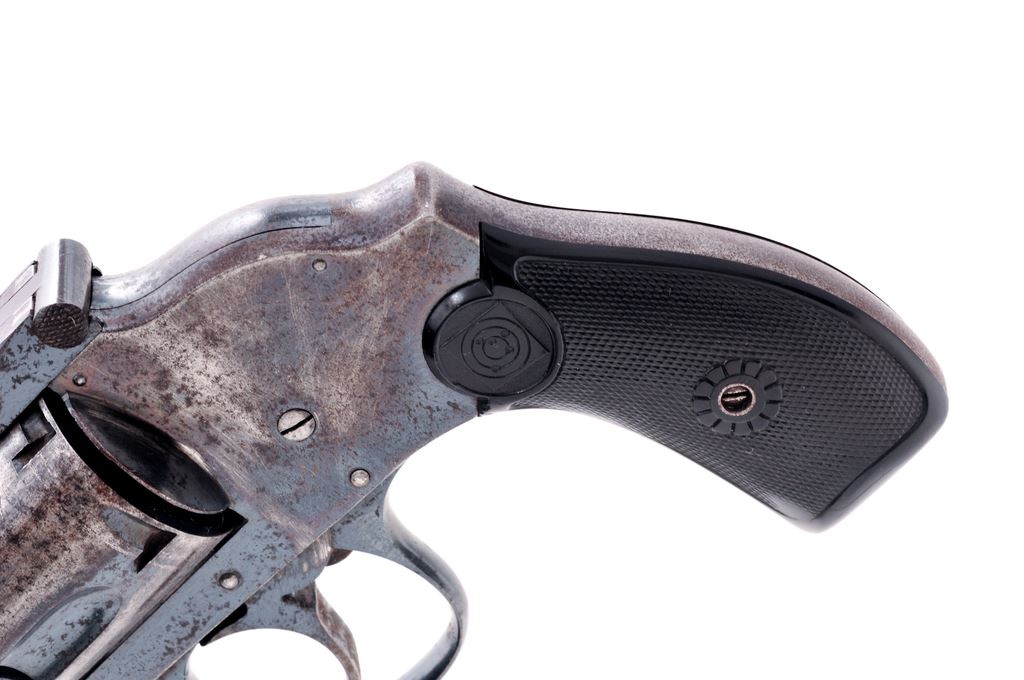 H&R Auto Eject Hammerless Double Action Revolver, #113669, .38 S&W cal., 3.25'' barrel, blue finish, hard rubber ''Target Logo'' grips with floral pattern. Top of barrel with name and address only, no patent dates; left side is marked with caliber designation. In good condition overall retaining approx. 50% thinning and toning blue. Grips show normal moderate age and wear. Good action and bore. Est.: $100-$200. (C&R/PPT)