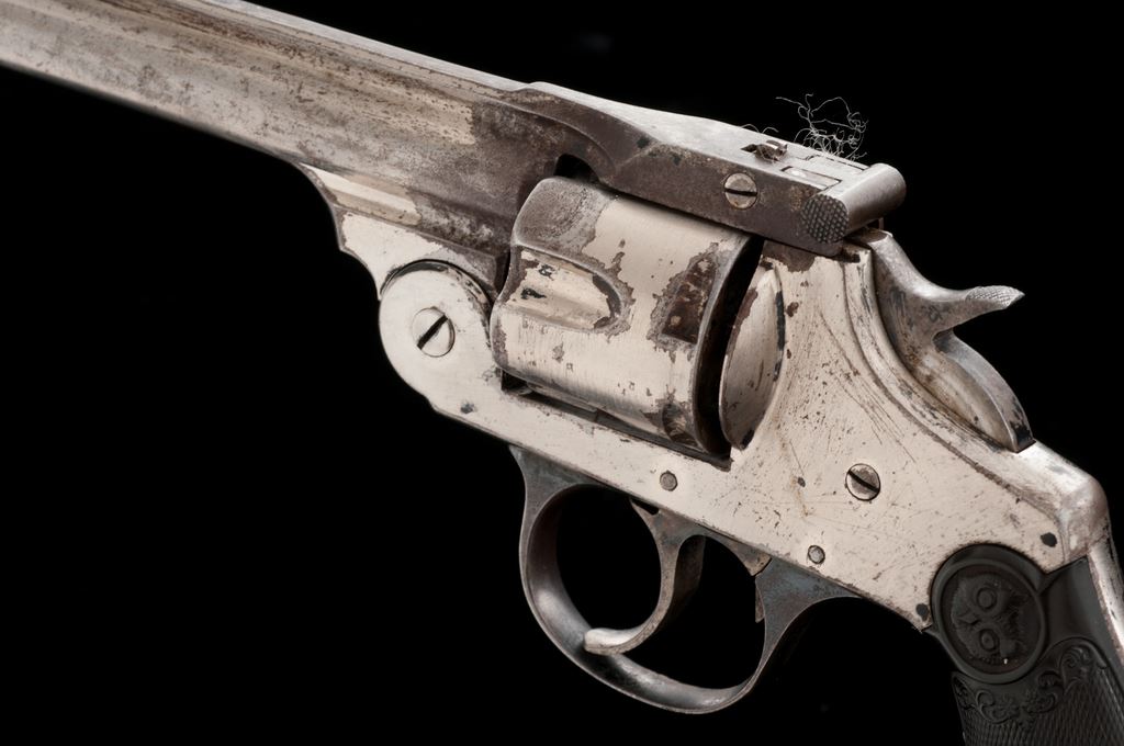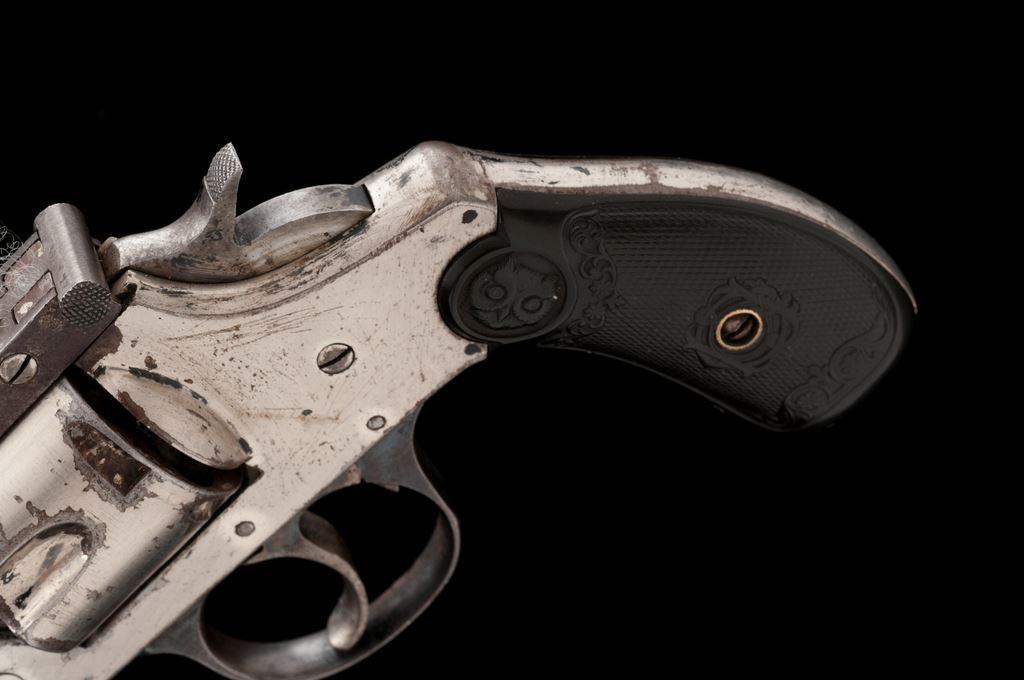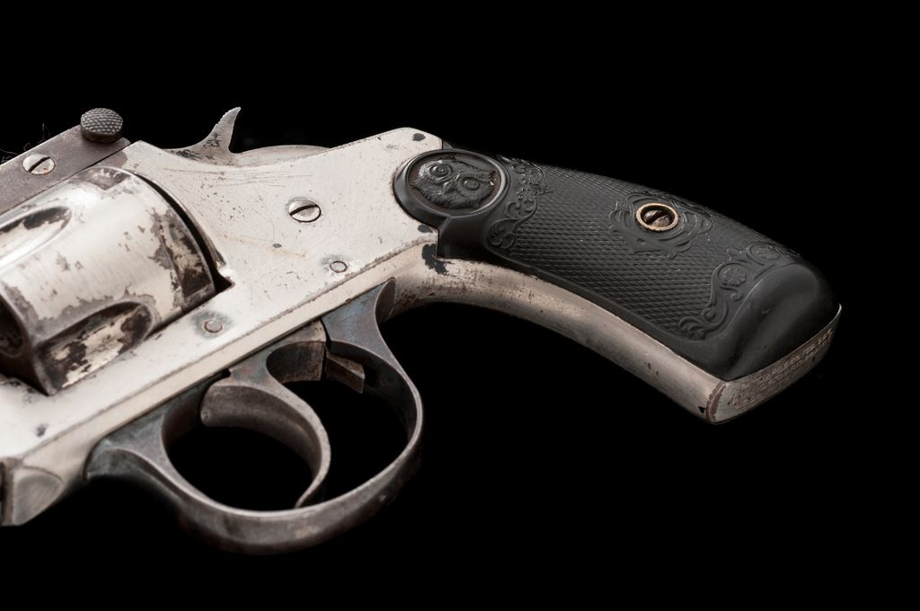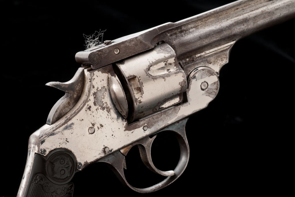 Iver Johnson Top-Break Double Action Revolver, #60087, .38 cal., 6'' barrel, nickel finish, hard rubber ''owl's head'' grips, with standard sights. Patent dates are marked on butt. Condition is fair to good, metal with a combination of nickel finish and dark patina. Grips show signs of moderate wear and are free of any cracks; left grip with one tiny chip to the front edge. Good action and bore. Est.: $100-$150. (C&R/PPT)