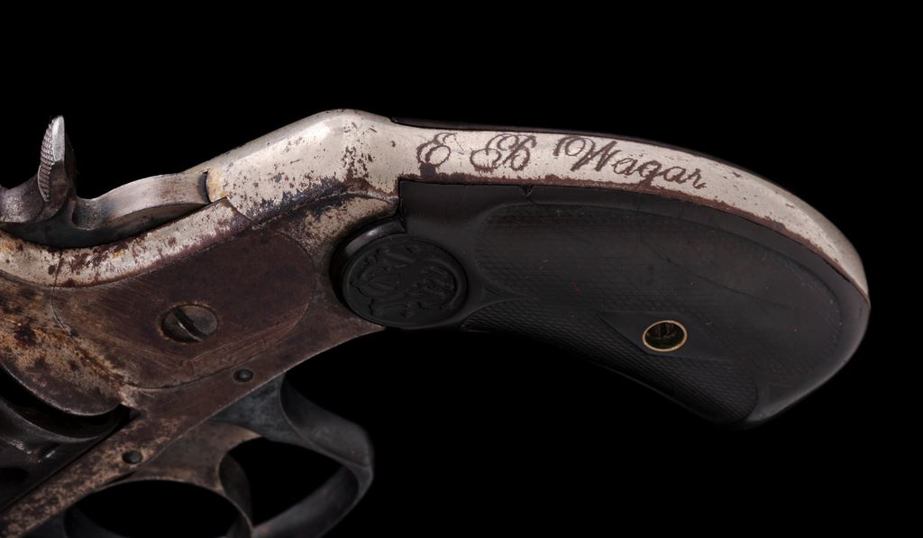 Antique Smith & Wesson .38 Double Action Third Model Revolver, backstrap with the name E.B. Wagar engraved into the surface, #141855, .38 S&W cal., 3.25'' barrel, nickel finish, checkered hard rubber grips with S&W monogram, standard sights, case hardened hammer and trigger. Visible numbers on the cylinder and top latch match the frame. Condition is fair with approx. 55% nickel finish; balance is brown in color. Barrel address is clear. Grips show flattening to the checks; right grip with a piece missing from the lower rear corner. Hammer and trigger with a combination fading case colors and brown patina. Good action and lightly pitted bore. Est.: $75-$150. (Antique)