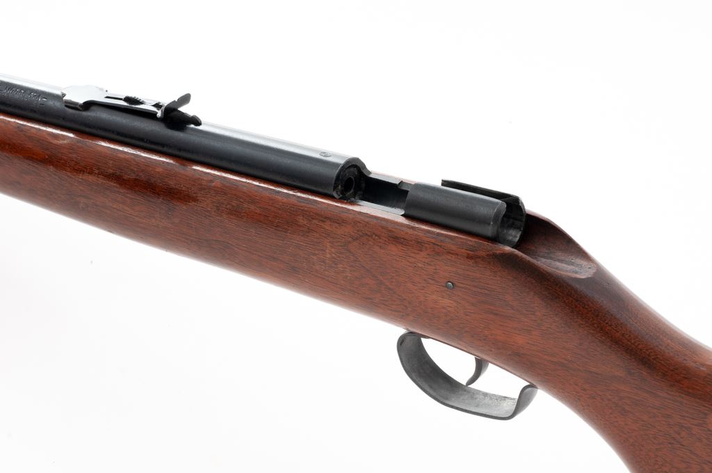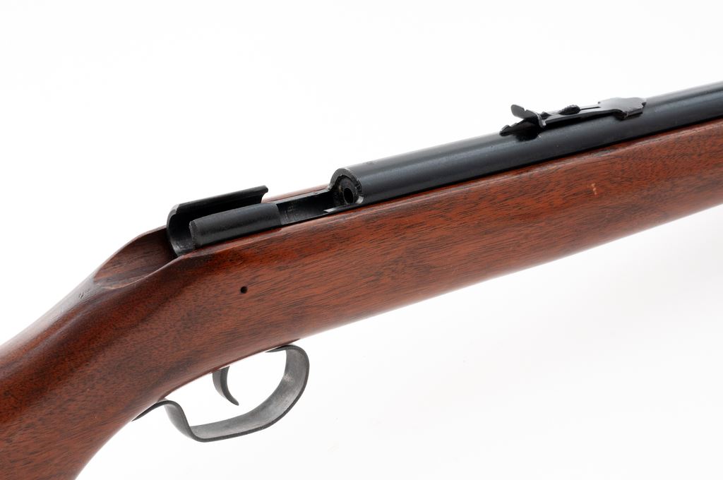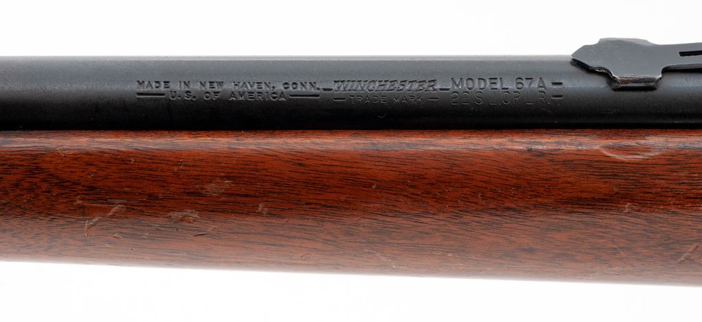 Winchester Model 67A Single Shot Bolt Action Boy's Rifle, missing bolt, NVSN, .22 S-L-LR cal., 20'' barrel, blue finish, one-piece pistol-grip walnut stock, checkered black composite Winchester buttplate, dovetailed silver bead front sight and notched rear sight with elevator. Condition is very good. Barrel with approx. 97% remaining blue, factory lettering is crisp and clear; triggerguard shows moderate toning. Wood with general mostly small scratches and handling marks with intermittent spots of thinning or flaking to the finish. Bore is bright with good rifling. Est.: $80-$120. (C&R)