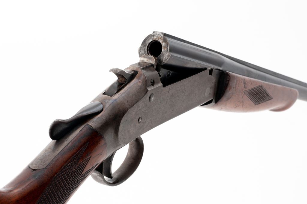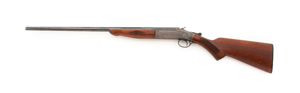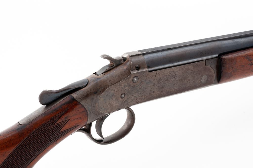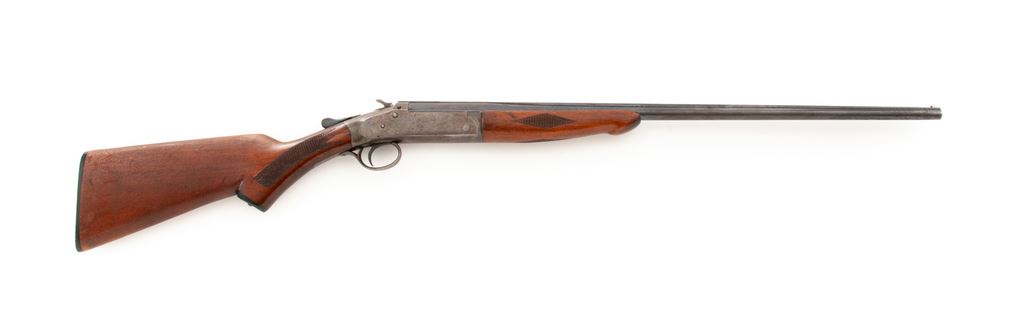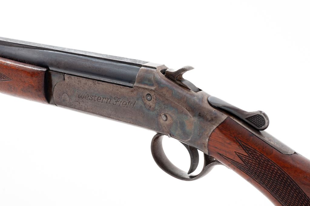 Westernfield .410 Bore Single Shot Shotgun, #90440, 26'' solid rib barrel, blue finish, case colored receiver, checkered pistol-grip walnut stock and Schnabel forend, black composite buttplate, with brass bead front sight. Condition is good. Barrel with a combination thinning blue and brown patina. Receiver with approx. 30% case colors, bottom with a few hand applied notches. Finish on the buttstock with overall fine crazing, otherwise wood shows age and wear consistent with the rest of the shotgun. Break-open action, hammer, and trigger function smoothly; bore is bright. Est.: $80-$160. (C&R)