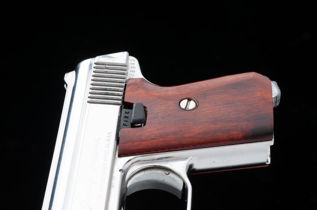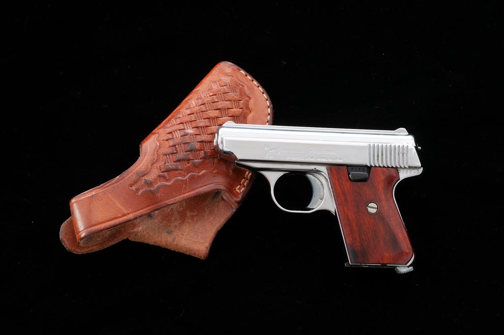 Jennings Model 25 Semi-Automatic Pistol, #028942, .25 ACP cal., 2-1/2'' barrel, chrome finish, smooth wood grips, with standard integral sights. No magazine. In a Bianchi right-hand brown leather holster with basketweave pattern. Condition is very good. Most of the chrome finish remains with scattered light scratching. Grips with a few shallow handling marks. Very good action and bore. Holster with moderate carry wear. Est.: $40-$80. (Modern/PPT)