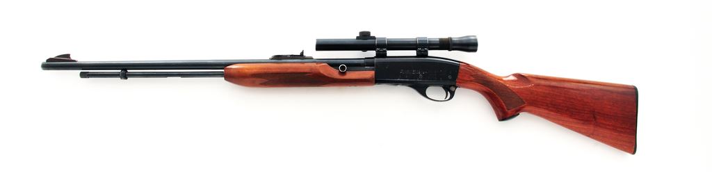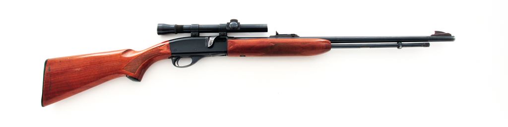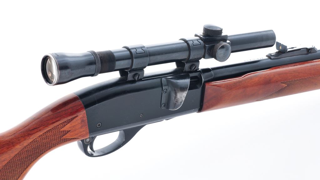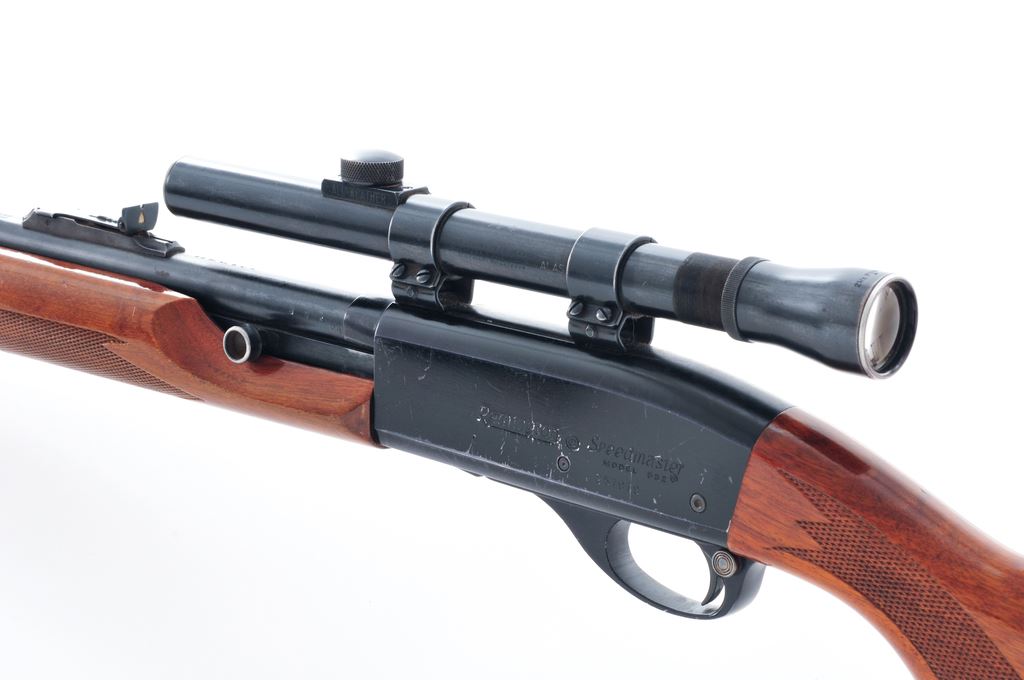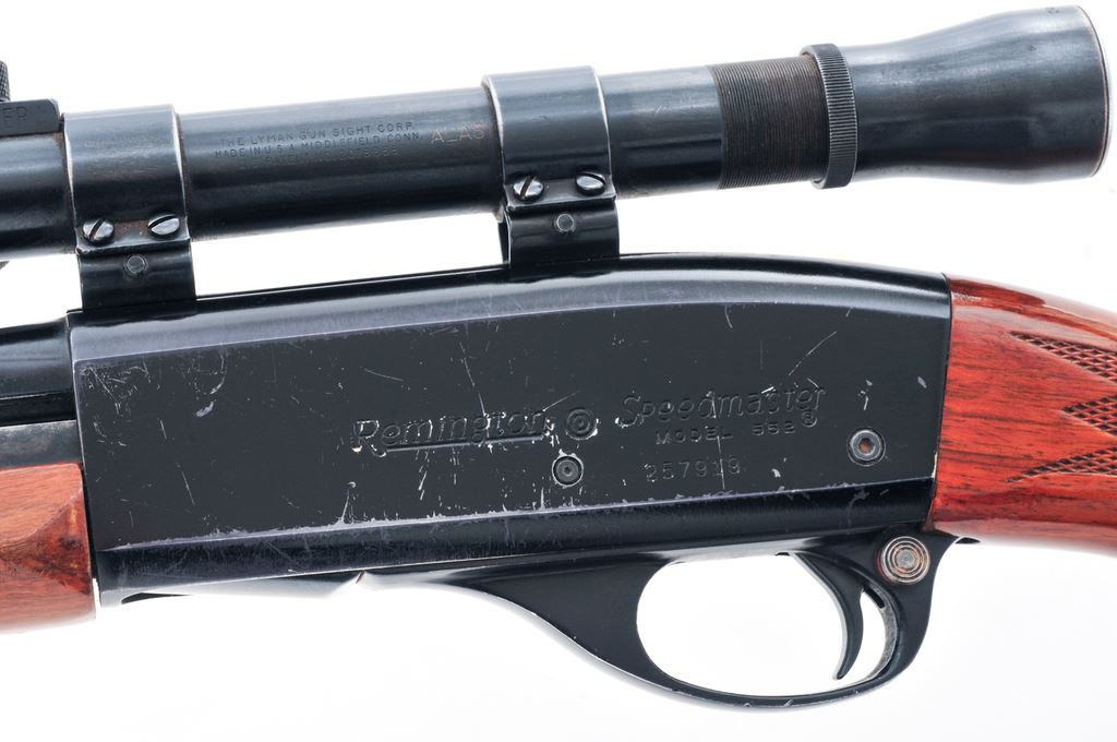 Remington Model 552 Speedmaster Semi-Automatic Rifle, with Lyman Alaskan scope, #257919, .22 S-L-LR cal., 23.5'' barrel, blue finish, press checkered pistol-grip walnut stock with gloss finish, black composite Remington buttplate, tall blade front sight, elevator rear sight mounted to a fixed base. Topped with a Lyman Alaskan 2-1/2-power scope that is mounted to the factory grooved receiver. Scope without a reticle and the front sight is in the field of vision. Condition is good with approx. 85%-90% original finish. Receiver with considerable surface scratching and edgewear, more frequent on the left side. Barrel with thinning and rub marks along the top edge. Factory lettering is clear and well defined. Wood with scattered shallow pressure dents and scratches, mainly along the bottom edges; majority of the finish remains with some flaking and thinning to the highpoints and bottom edge of forend. Very good smooth action; bore with a slight bulge and is ringed at about the mid-point. Optics are a little cloudy but the glass is free of chips or cracks. Est.: $100-$200. (C&R)