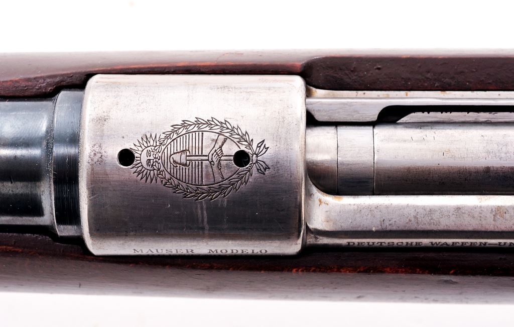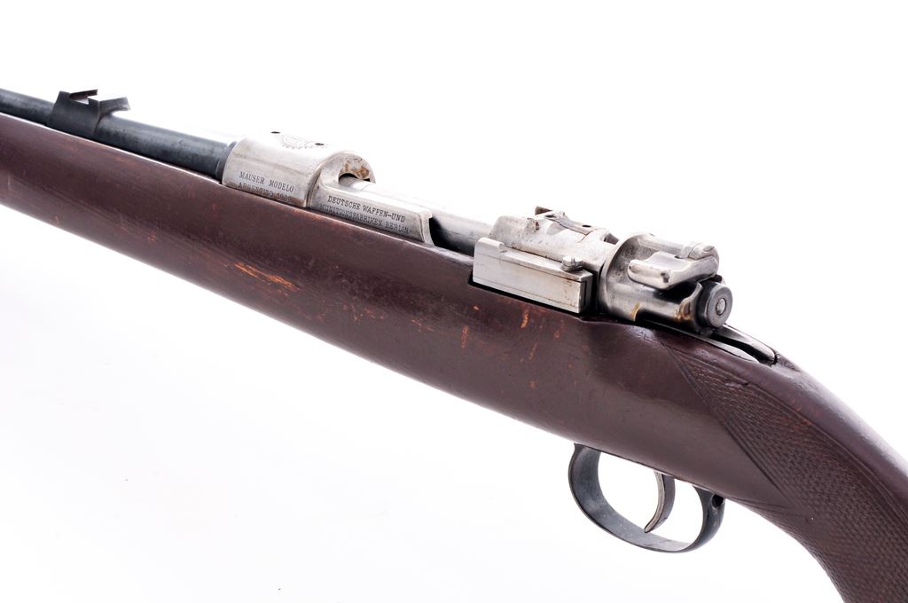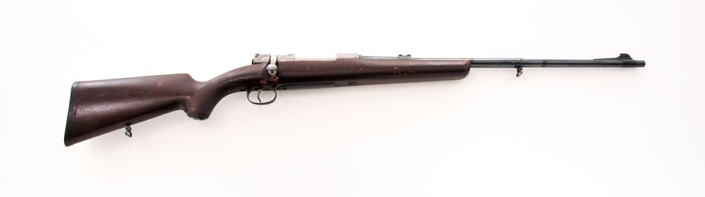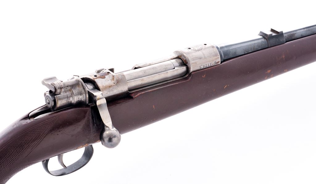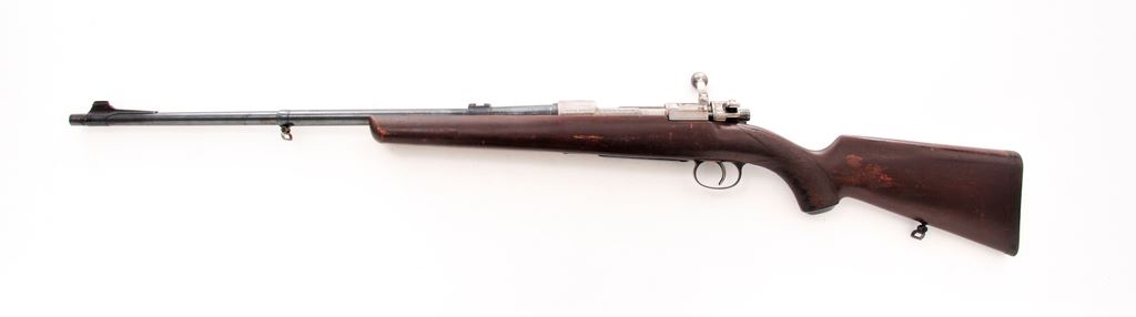 Sporterized M1909 Argentine Mauser Bolt Action Rifle, #L9251, 8x57mm cal., 24'' barrel, blued finish, hardwood stock, blade front sight with bead, rear sight has been removed. Rifle receiver is stamped on left side ''MAUSER MODELO ARGENTINO 1909'' and ''DEUTSCHE WAFFEN -UND MUNITIONSFABRIKEN BERLIN''. Left side of custom barrel is stamped ''HUSQVARNA VAPENFABRIKS AB. KAL. 8m.m.'' Bolt handle is deeply dished to accommodate the scope. Thin 1'' sling swivels are fitted. White spray paint is evident along right side of rifle and scope. No visible import marks. Condition overall is very good with metal surfaces showing over 80% finish with action and bolt left bright. Stock is covered with a heavy coat of brown paint and shows scattered scratches and gouges. Slot for bolt handle has been roughly cut and filed. Action is smooth, bright bore is very good. Est.: $100-$200. (Modern)