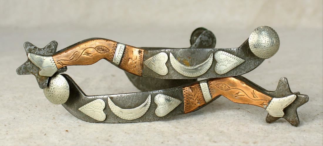 Single mounted two-tone spurs with nicely engraved hearts, moons and copper legs.