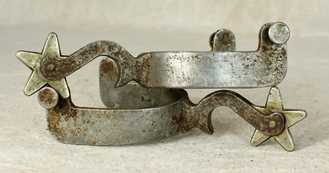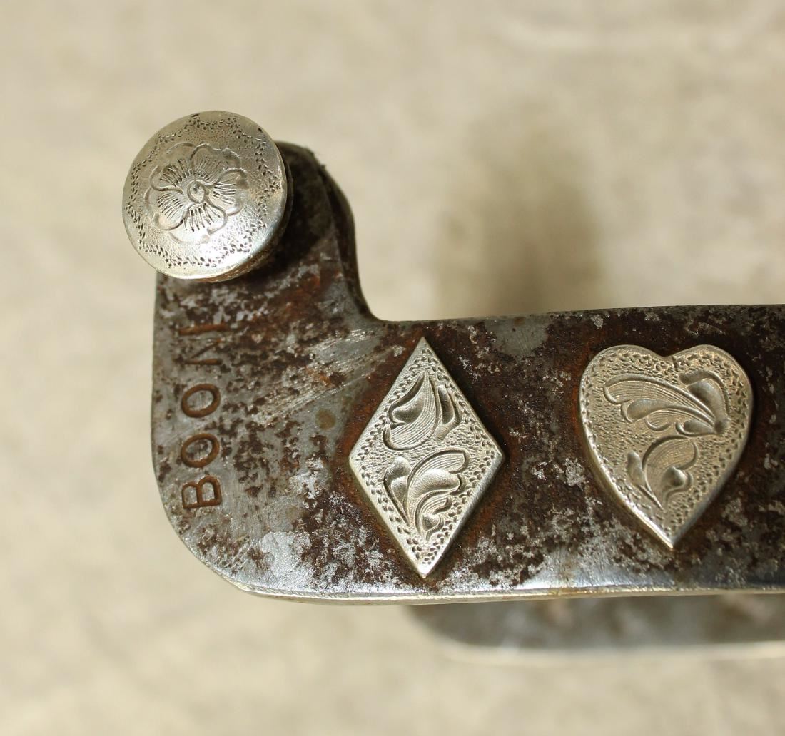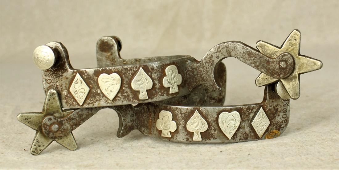 Large pair of single mounted bottle openers with nicely engraved card suite pattern. Well marked on both spurs.