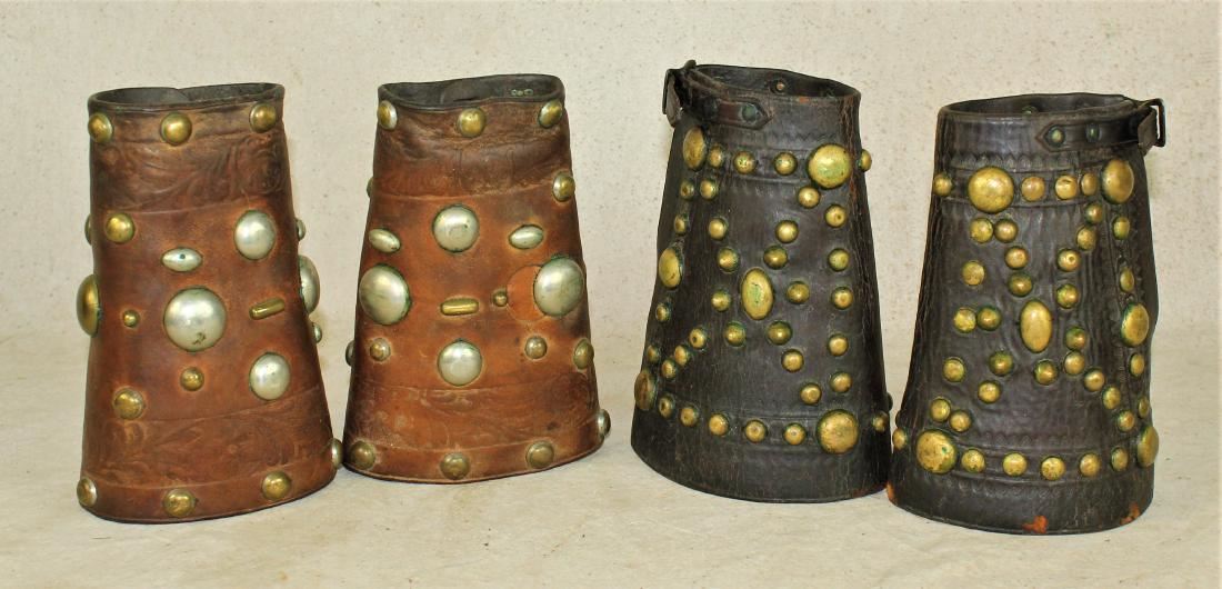 Two pair of leather wrist cuffs; one basket weave carved with three leaf “club design decorated with brass studs in overall good condition; the other pair is edge tooled with large 5-point star studded design.