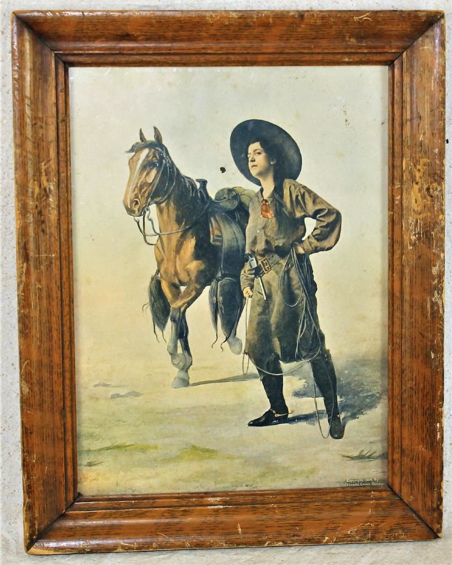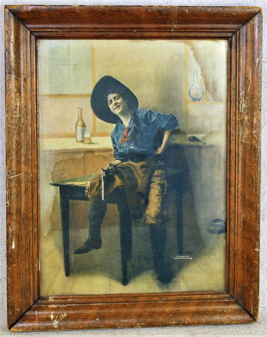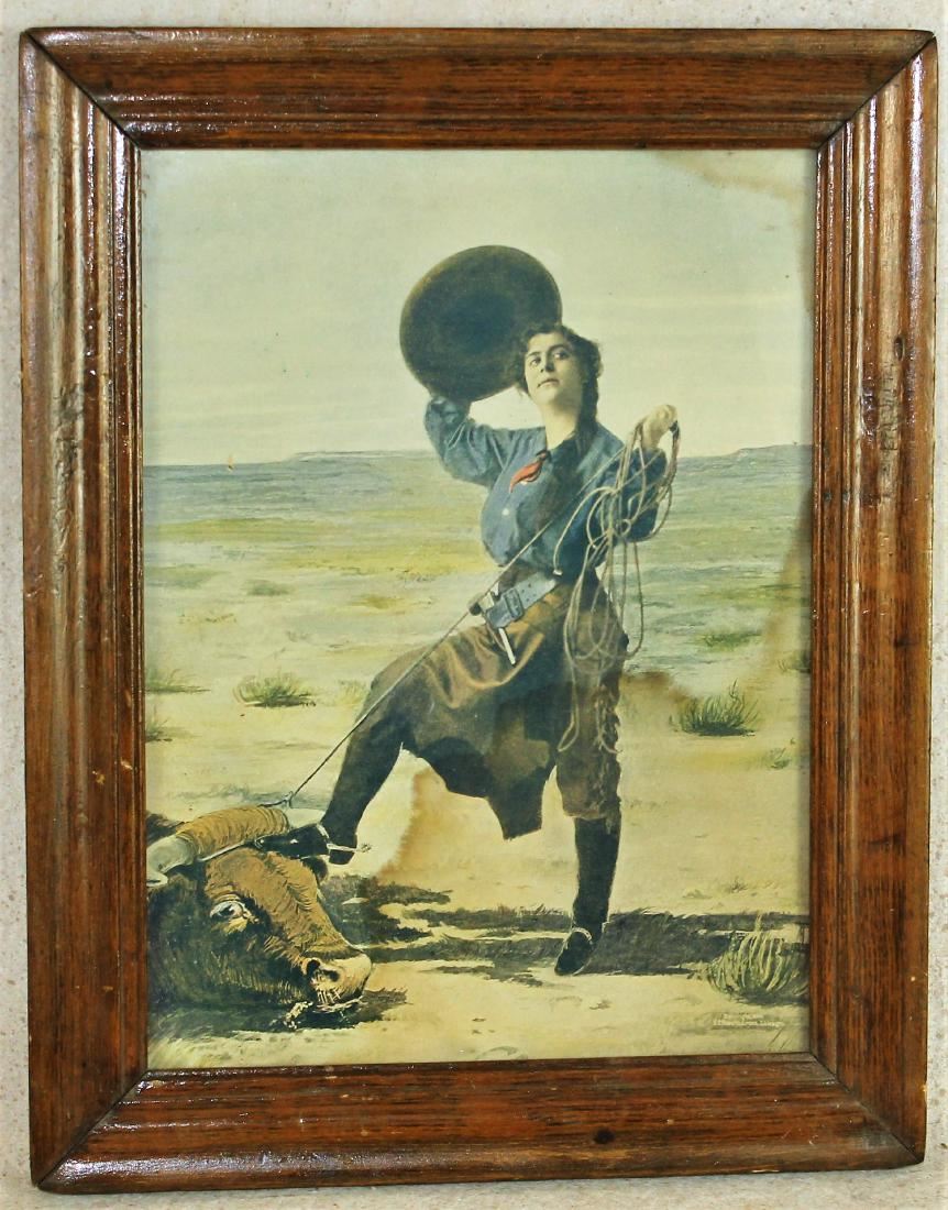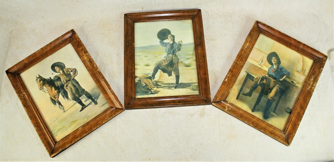 Set of three early cowgirl lithographs, copyright 1904 by J Ellsworth Gross, with posing sassy cowgirls. Nicely period framed, with each image measuring 8 1/2"x 11 1/2".