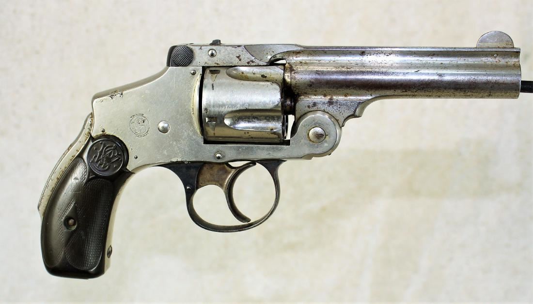 Grouping of three pocket revolvers including; 1) Smith & Wesson double action in 32 caliber 2) Smith & Wesson single action in 32 caliber, and 3) Vest Pocket snub nose 22 caliber.