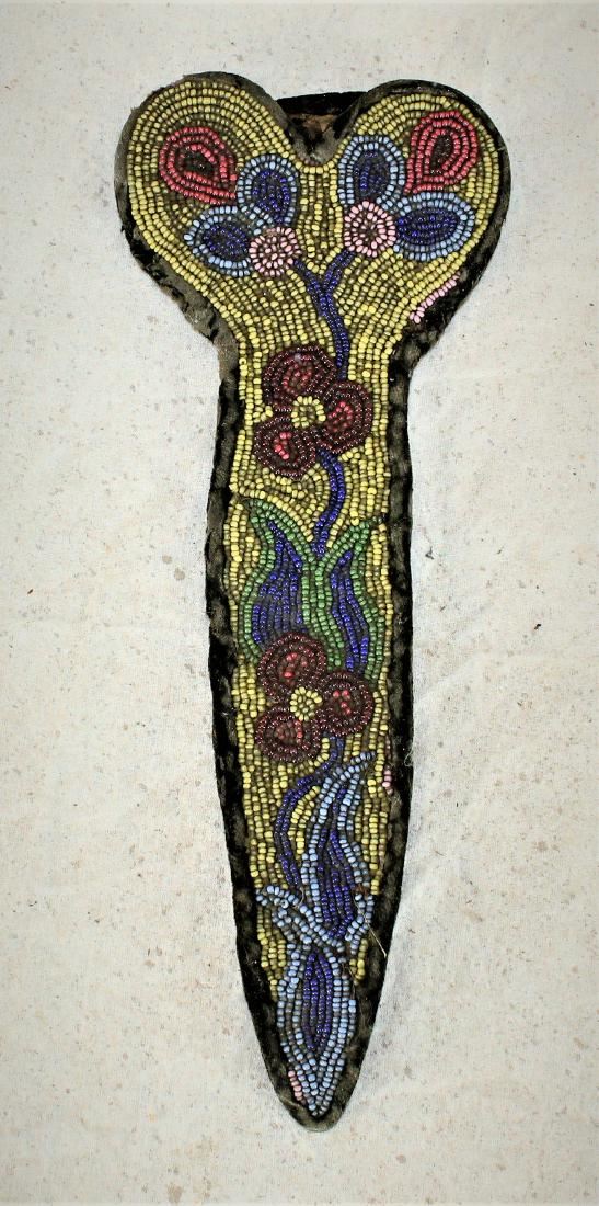 Pre-1900 shaped pouch with great design of greasy yellow background with red white heart and blue floral design on hide with period velvet piping.