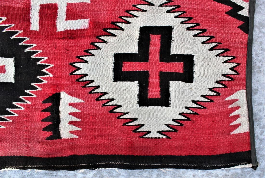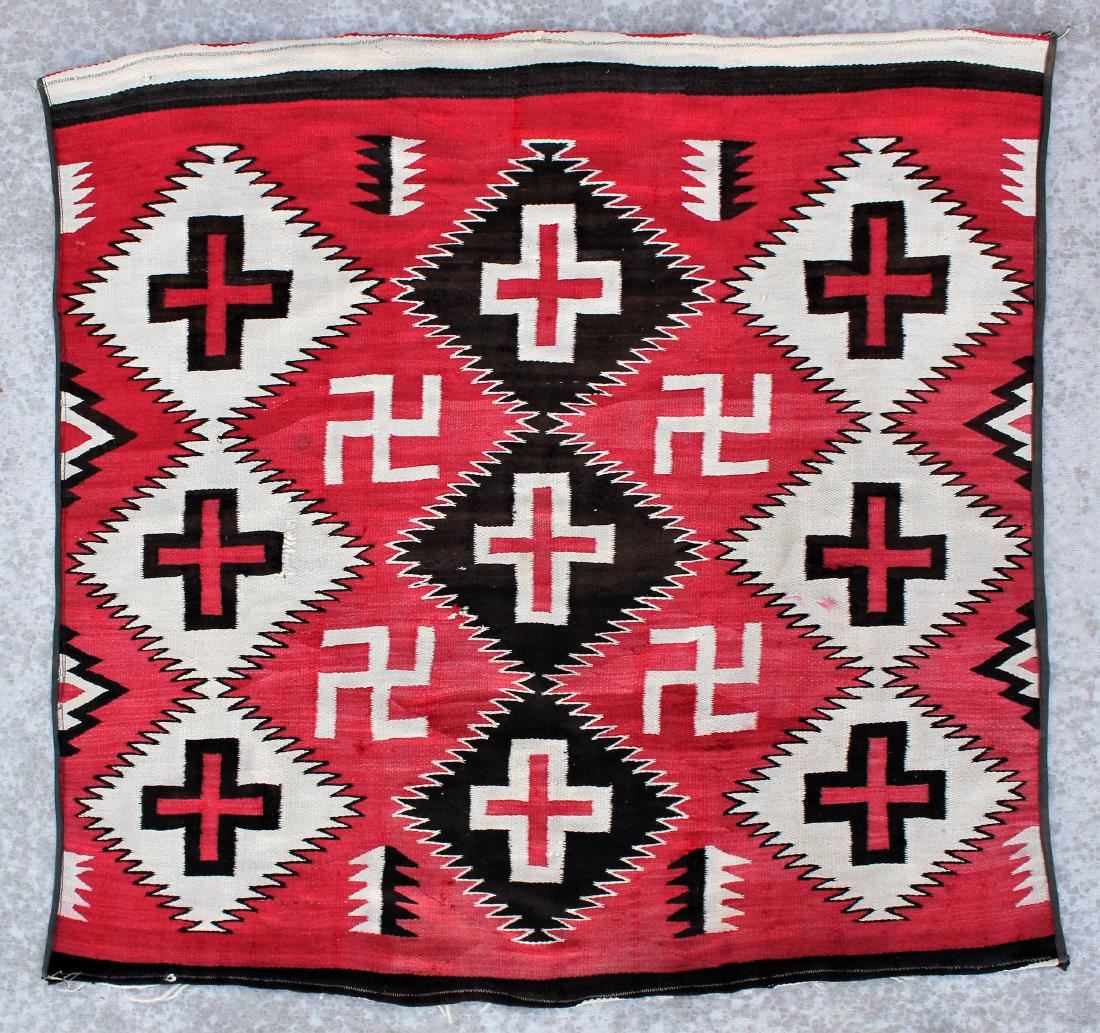 Striking 1910 Ganado pattern rug with wonderful whirling log design, having brilliant red and brown colors. I nice overall condition with bound reinforced edge. Dimensions 53"x 50"