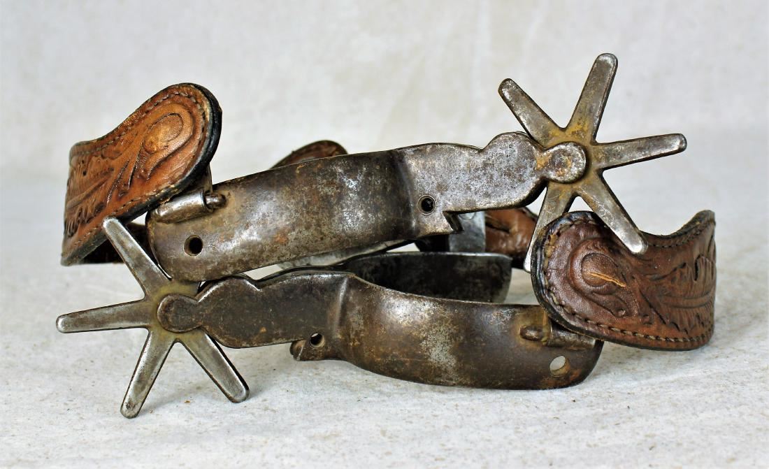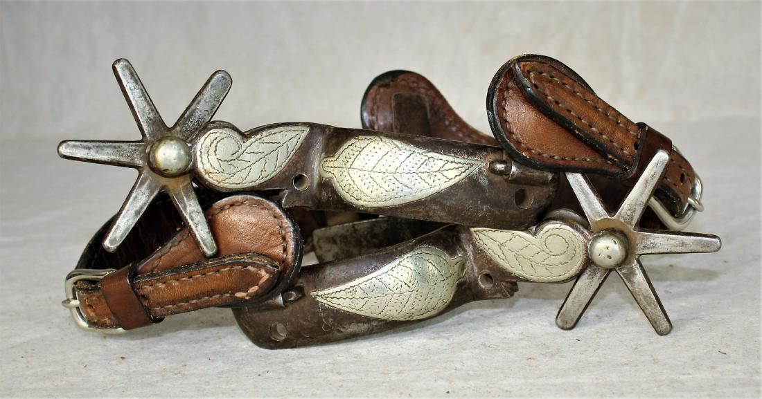 Desirable inside marked single mounted spurs with leaf pattern heelbands, showing nice condition and Oscar Crockett style engraving.