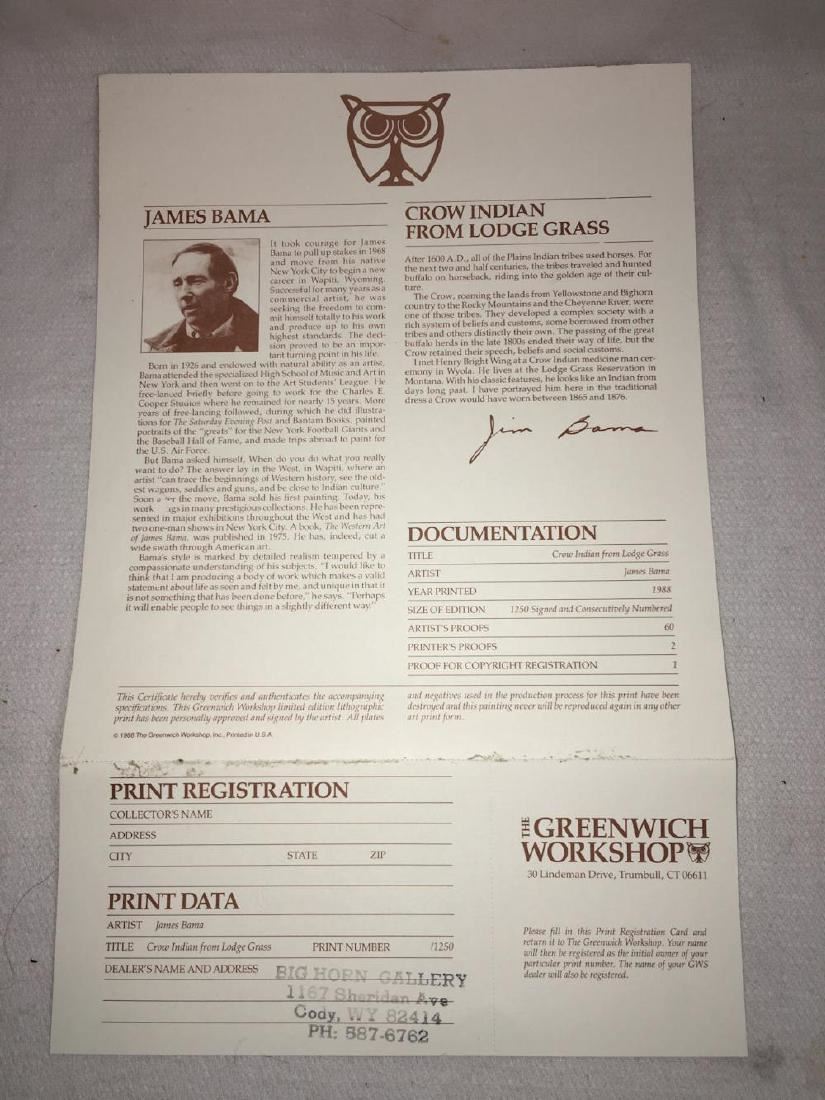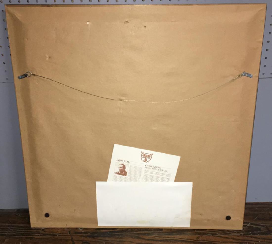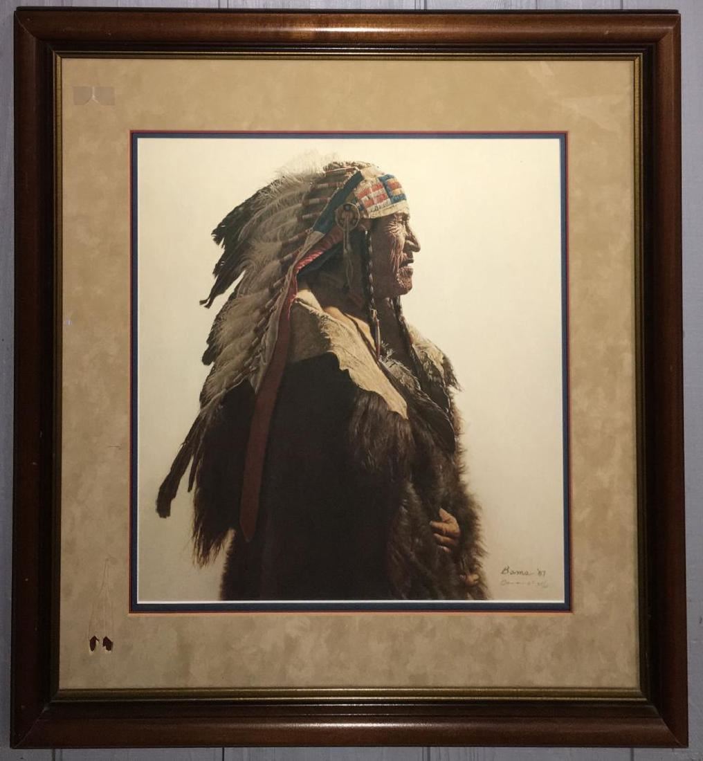 Limited artist proof entitled "Crow Indian From Lodge Grass". Marked Big Horn Gallery, Cody, Wy on back. Artist signed lower right: Bama. '87. A. P. 35/60. Framed And Under Glass: 29" X 28.75".