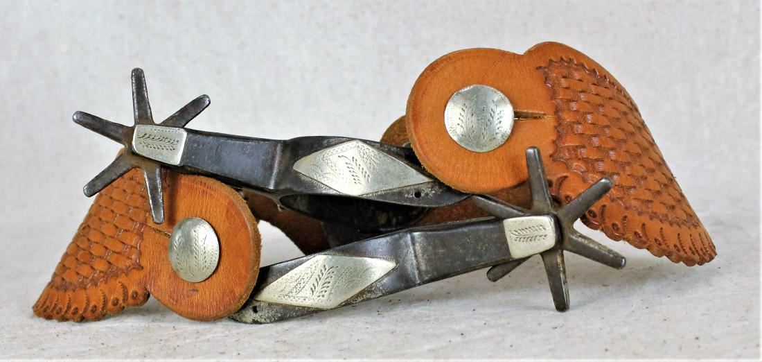 Classic single mounted working cowboy spurs with diamond pattern heelbands, huge 6 point rowels, and nice basket stamped straps.