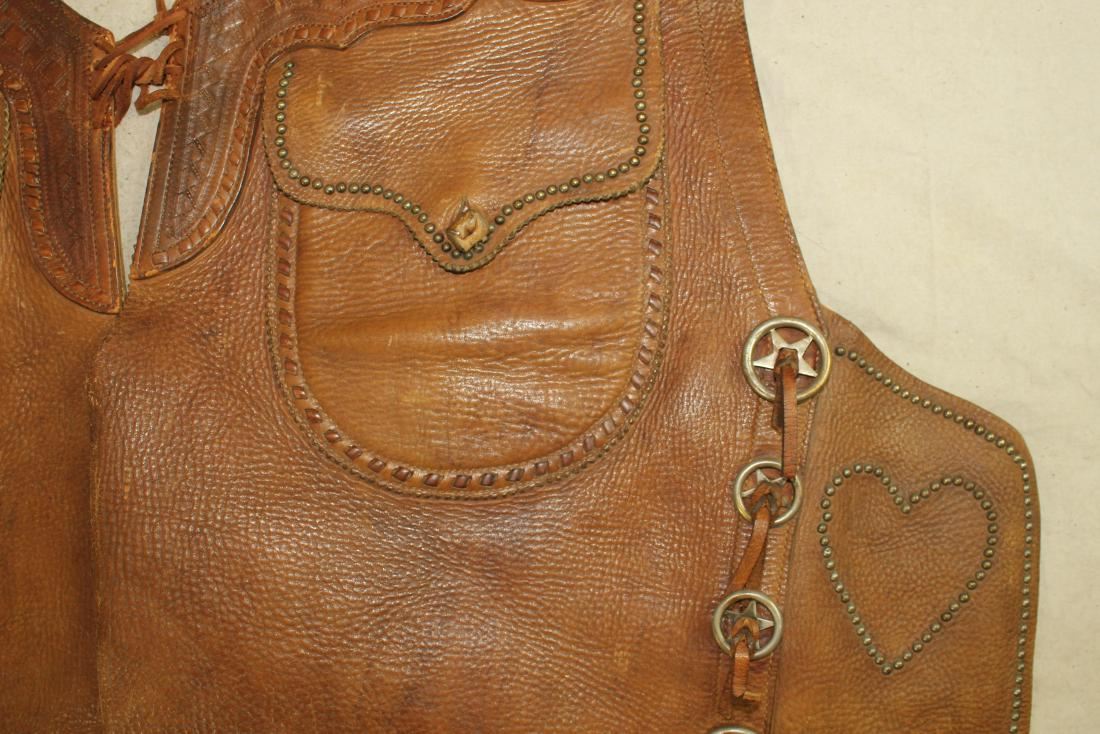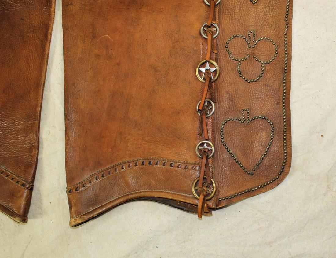 Terrific step-in style chaps with card suit studded wings, 22 Texas Star saddle string conchos showing great condition and eye appeal.